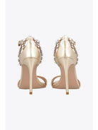 صندل PINKO مصنوع من القماش الرقائقي بمظهر الجلد مع سيور للكاحل مزينة بأحجار الراين وإبزيم معدني دائري صغير. مقدمة دائرية مع حزام أمامي. النعل في الوحدة، مادة صناعية ذات خصائص مشابهة للجلد. كعب عالي 10.5 سم ونعل داخلي من الجلد.