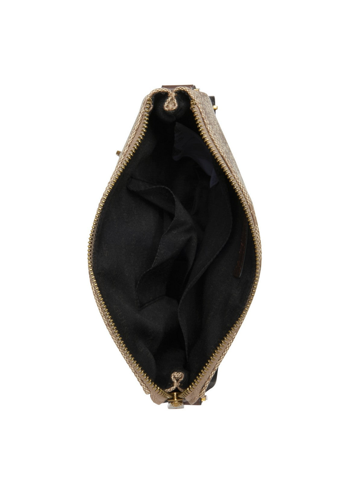 GUESS faux leather shoulder bag. All-over 4g logo and triangle on the front. External pocket and main compartment with zip. Adjustable fabric shoulder strap.