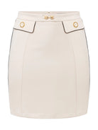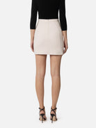 This mini skirt is designed to enhance the silhouette with modern elegance. The design is embellished with a refined jeweled horsebit with enamel logo, strategically positioned on the waistband for a distinctive touch. The contrasting piping details add definition to the garment, while the gold metal ring buttons recall a sophisticated and timeless style. An ideal choice for those seeking the perfect balance between class and femininity.