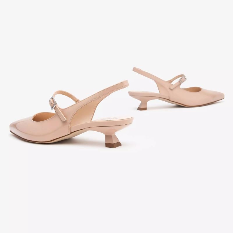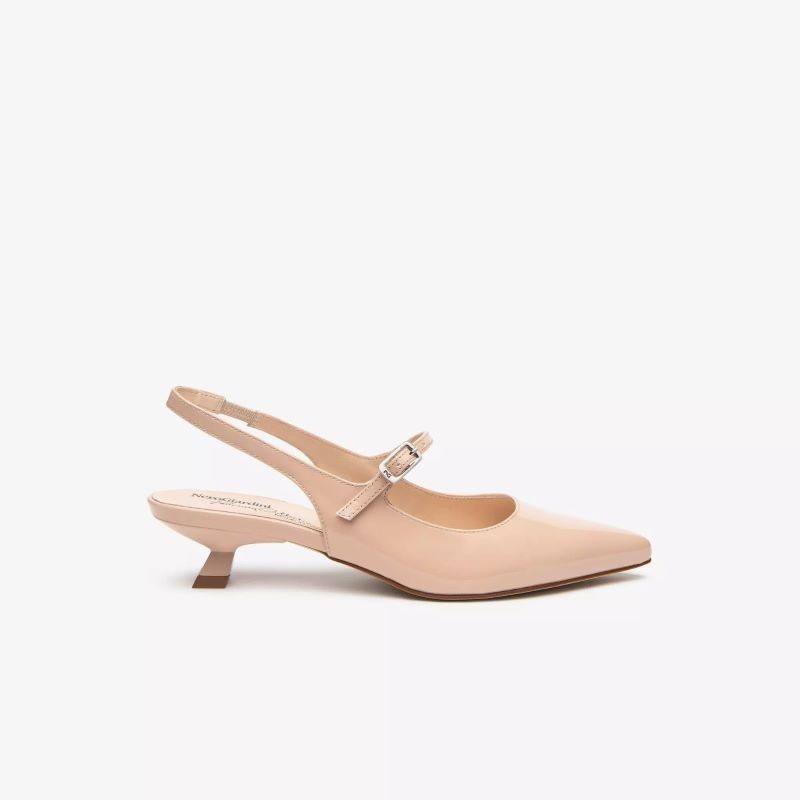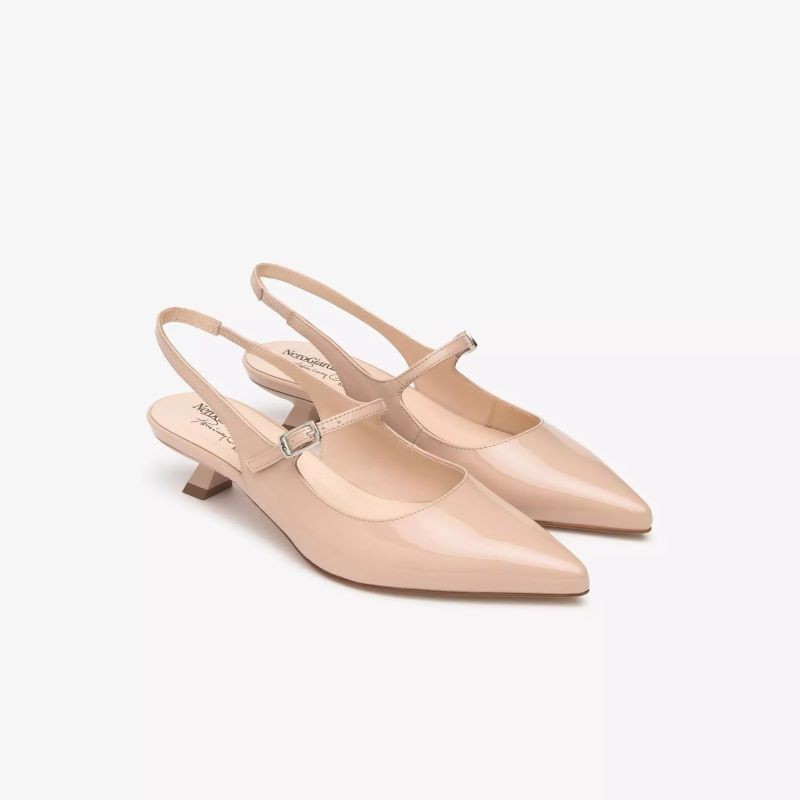 Nero Giardini women's pumps in powder/milk-colored patent leather with an adjustable slingback strap and buckle. The 3 cm flared heel adds elegance without sacrificing comfort. Leather lining and insole for a breathable fit, and a non-slip rubber sole for stability. Part of the Made in Italy Premium Collection, perfect for formal occasions, the office, and special evenings.