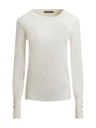 GUESS sweater in viscose blend, solid color with contrasting color logo on the bottom. Crew neck and long sleeves. High ribbed cuffs with buttons. Ribbed bottom and collar.