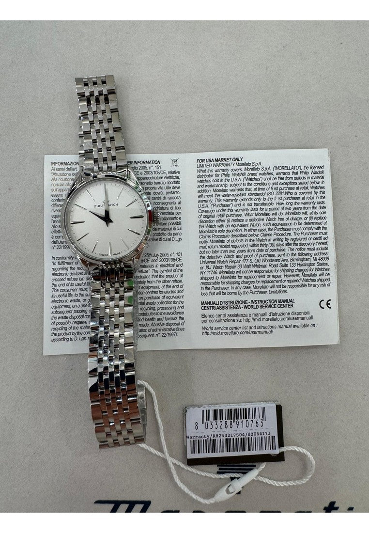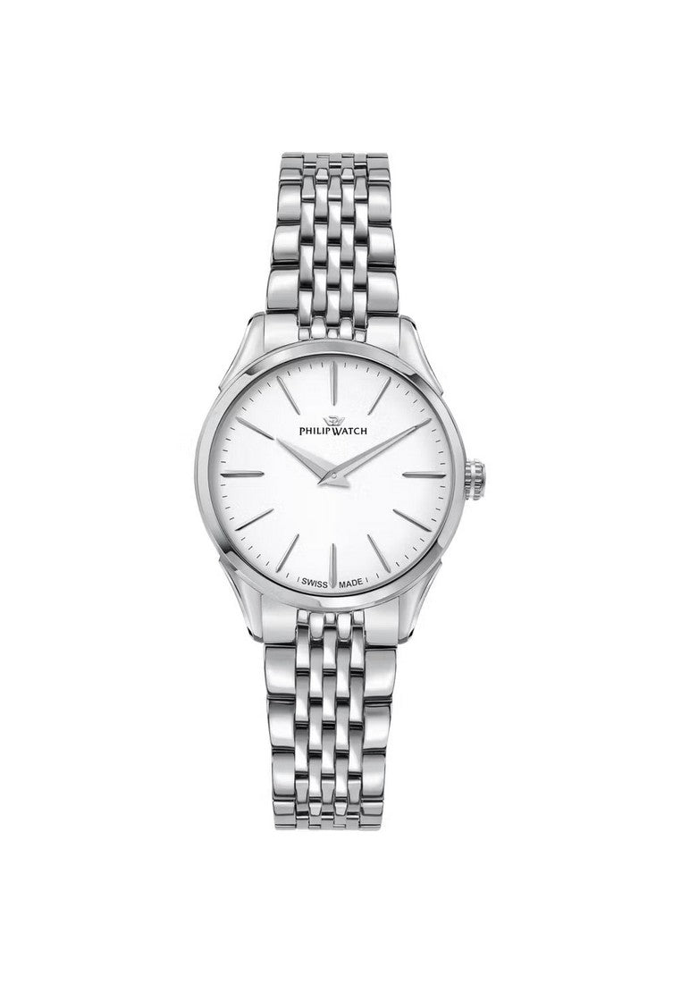 Drücken Sie Ihren einzigartigen Stil mit der eleganten Damenuhr aus der Roma-Kollektion von Philip Watch zum Ausdruck. Mit ihrem raffinierten und femininen Design ist diese Uhr das perfekte Accessoire, um Ihren Look zu vervollständigen. Das Stahlgehäuse mit einem Durchmesser von 32 mm verleiht dem Handgelenk einen Hauch von Anmut. Das strahlend weiße, silberne Zifferblatt sorgt für einen hellen und raffinierten Kontrast. Das silberfarbene Metallarmband verleiht einen Hauch von Klasse und sitzt bequem am Handgelenk. Dank der Behandlung des Saphirglases bleibt das Zifferblatt auch im Laufe der Zeit vor Kratzern und Gebrauchsspuren geschützt. Mit einer Wasserdichtigkeit von 5 ATM können Sie die Uhr bedenkenlos in verschiedenen Situationen tragen. Der Butterfly-Verschluss mit Knöpfen sorgt für einen sicheren und bequemen Verschluss. Mit der offiziellen 2-Jahres-Garantie von Philip Watch können Sie die Qualität und Zuverlässigkeit dieser Uhr genießen. Kaufen Sie die Damenuhr von Philip Watch aus der Roma-Kollektion und verleihen Sie Ihrem persönlichen Stil einen Hauch von Eleganz.