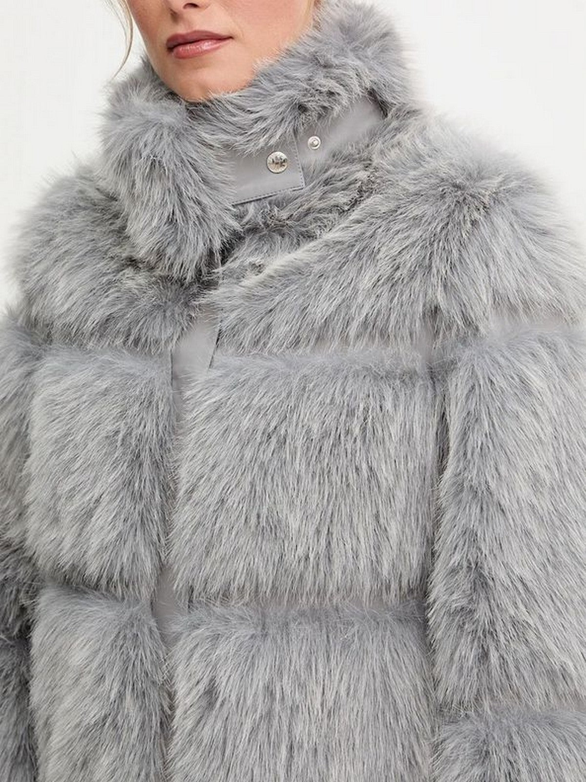 Cappotto fluffy PATRIZIA PEPE in pelliccia sintetica con polsi in maglia assicurano calore, mentre gli inserti in tessuto spalmato definiscono le maniche e il profilo della chiusura a bottoni.