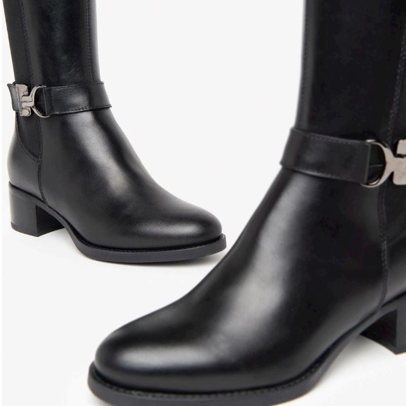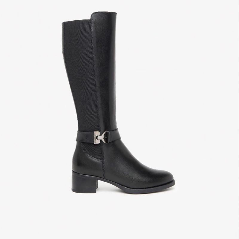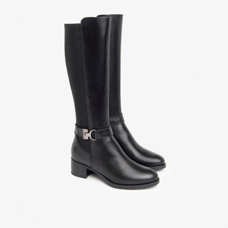 A minimalist elegance that won't go unnoticed: the NeroGiardini I411993D boot is the perfect choice for those seeking refined yet practical style. Crafted from the highest-quality black leather, it stands out for its elasticated shaft that comfortably hugs the leg, slimming the silhouette. The metallic NG logo detail on the strap adds a sophisticated and modern touch, while the 4 cm block heel ensures stability and comfort all day long. The interior is lined in leather and fabric, ensuring breathability and comfort even during the longest days. Wear with midi dresses, skirts, or slim trousers for a chic and timeless look.