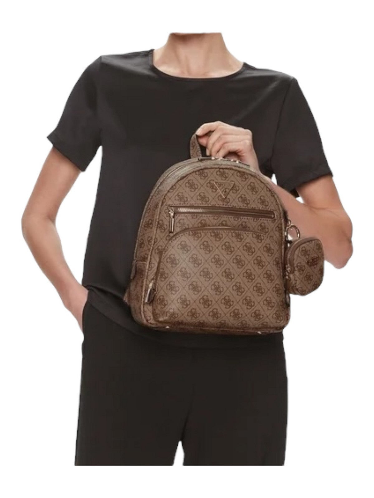 GUESS faux leather backpack, all-over 4g logo motif. Metal logo triangle on the front.