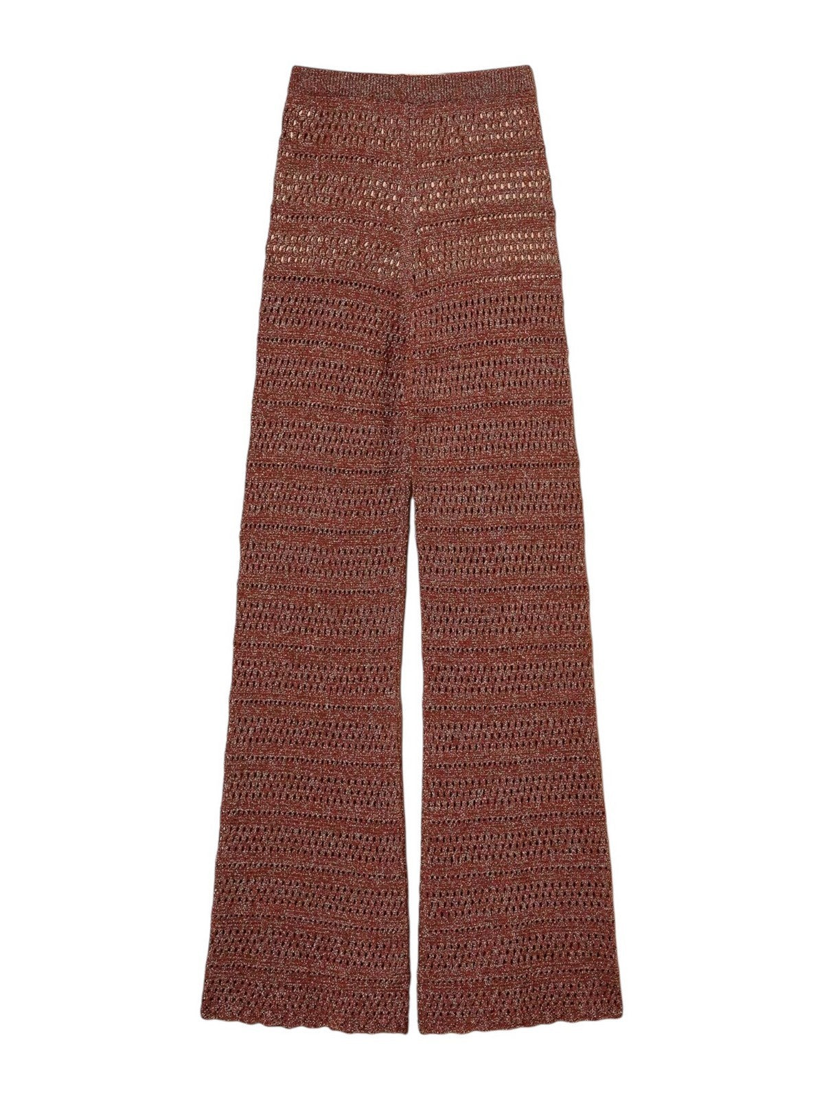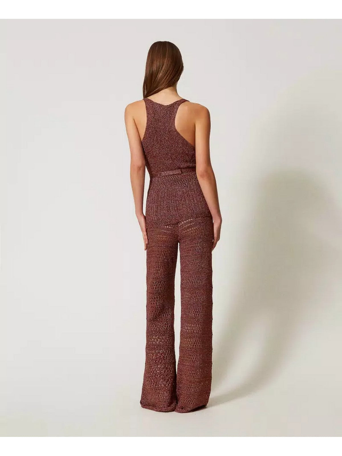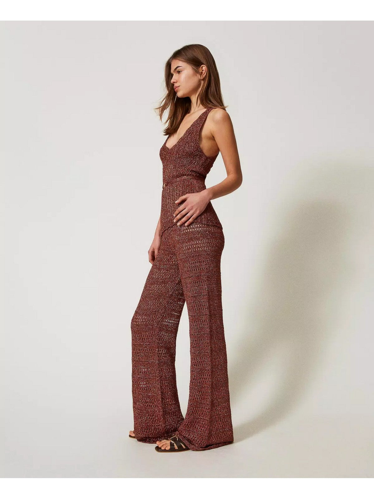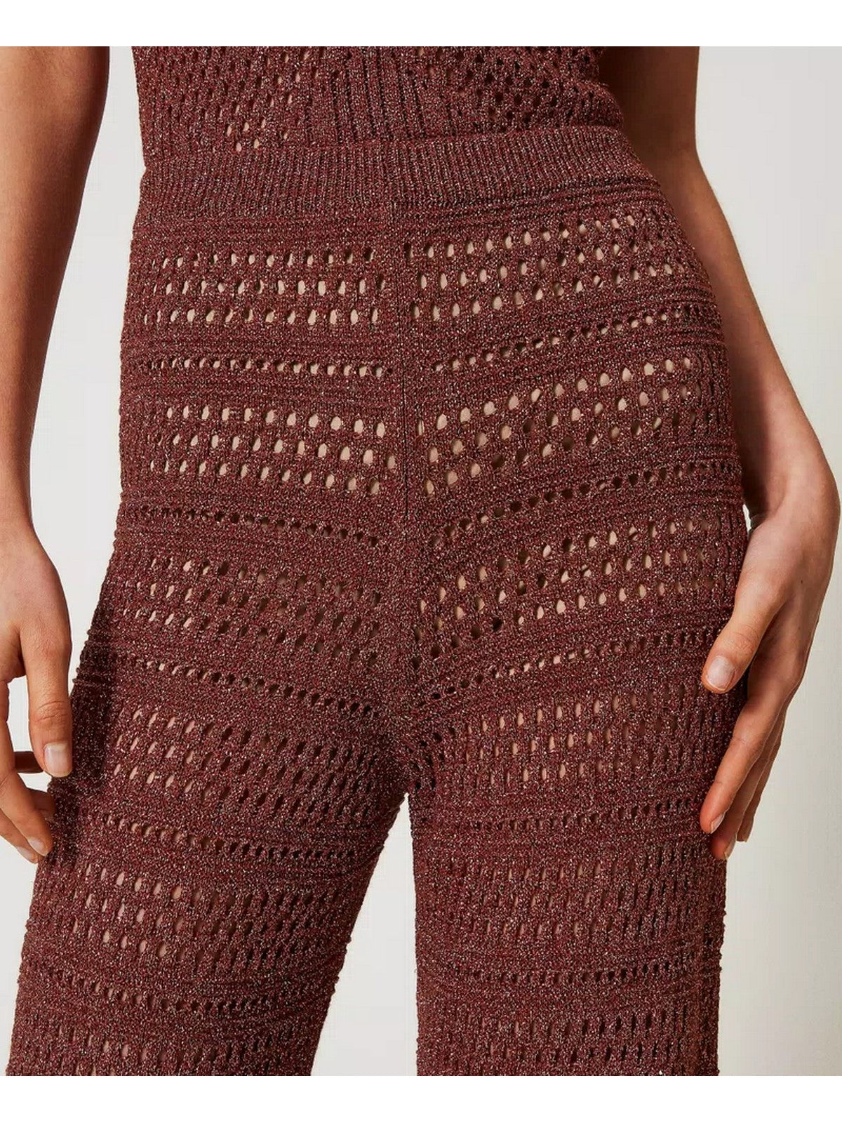 TWINSET knitted trousers in a lurex viscose blend with punched workmanship alternating with links stitches with a horizontal striped effect.