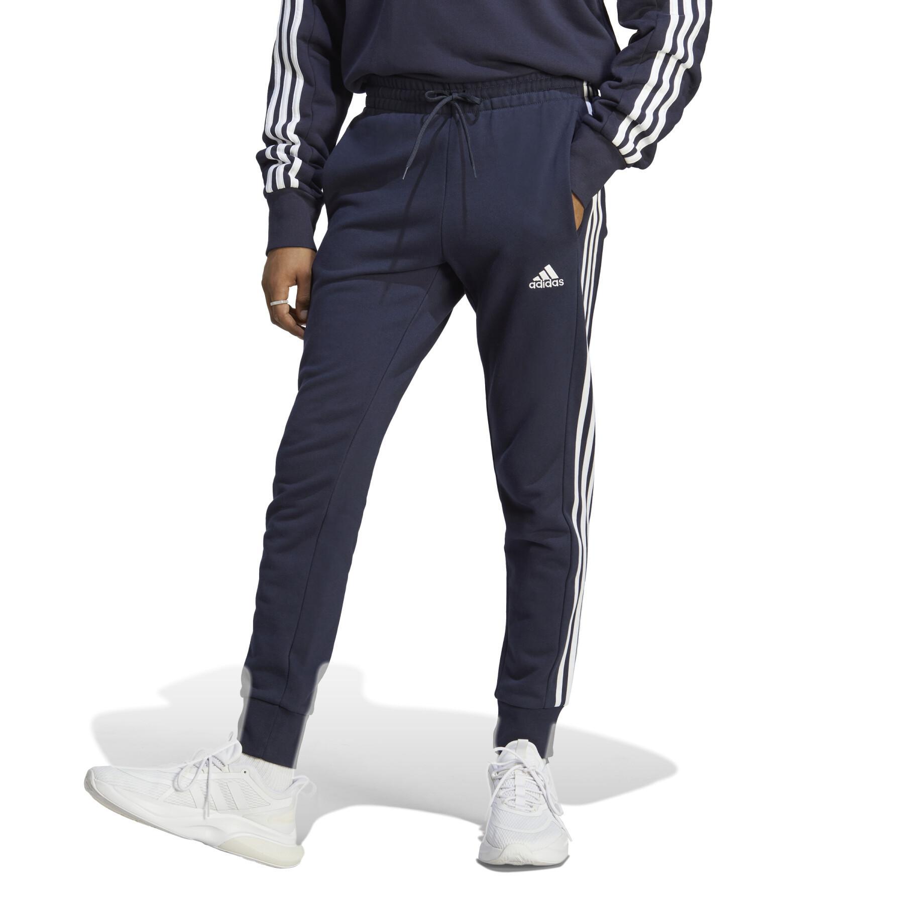 Adidas essentials tracksuit bottoms in French terry (brushed cotton) with three stripes. Versatile and sporty Adidas men's tracksuit bottoms for casual everyday wear. Regular fit, adjustable elastic waistband with drawstring, 100% cotton, side pockets, and ribbed cuffs. Salbini technical sports items is an Adidas retailer.