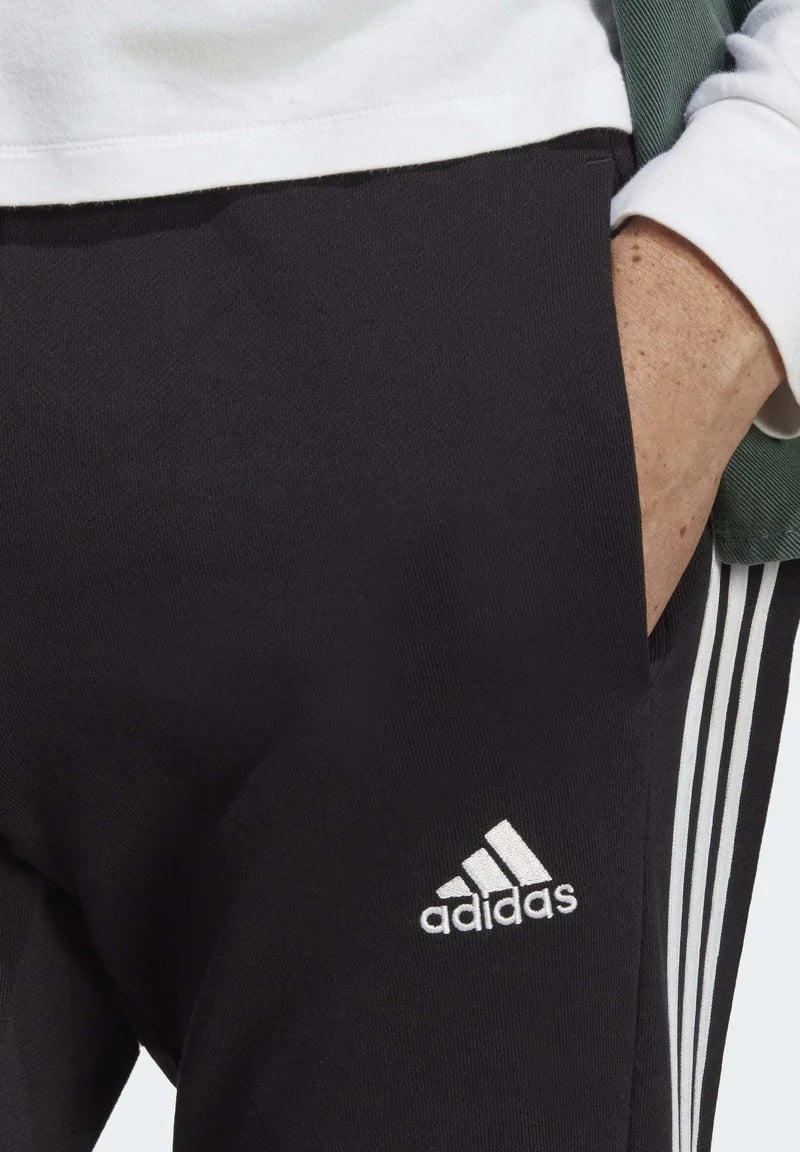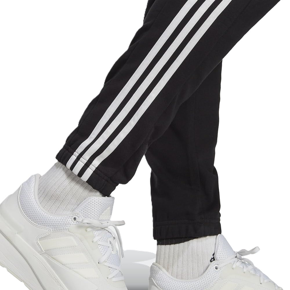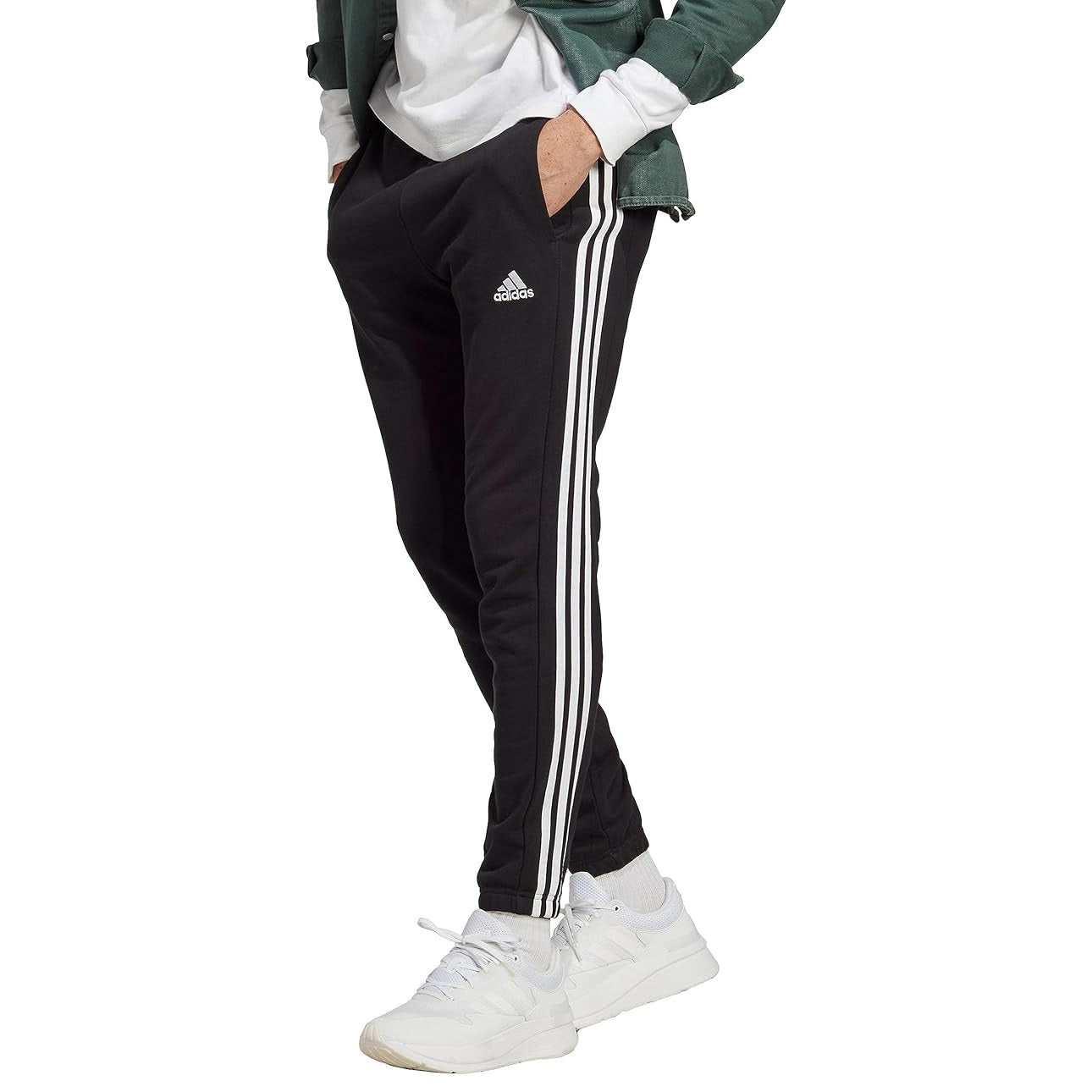 Adidas essentials tracksuit bottoms in French terry (brushed cotton) with three stripes. Adidas men's tracksuit bottoms that pair with any outfit for all-day comfort. Regular fit, elastic drawstring waist, 100% cotton, side pockets, tapered legs, and elastic cuffs. Salbini technical sports items is an Adidas retailer.