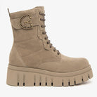 The suede upper softly envelops the foot, while the internal zip allows for a quick and easy fit. The lace-up front closure, inspired by military boots, completes a bold and feminine look.