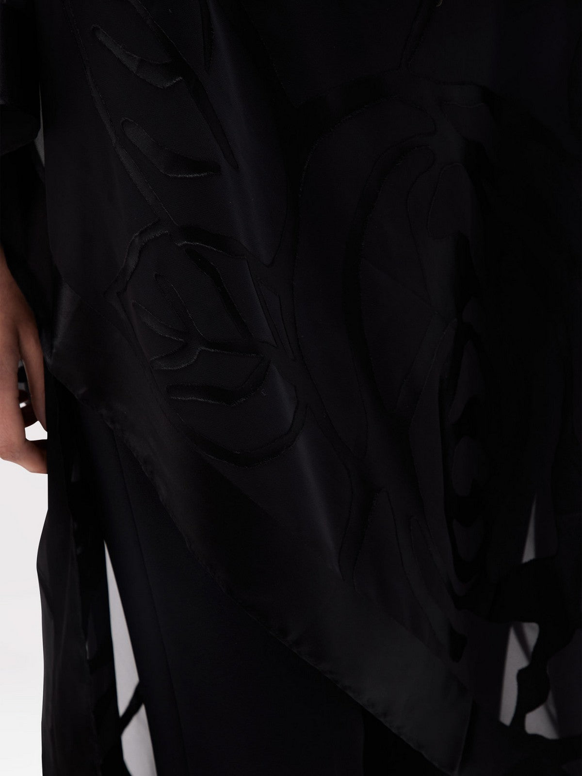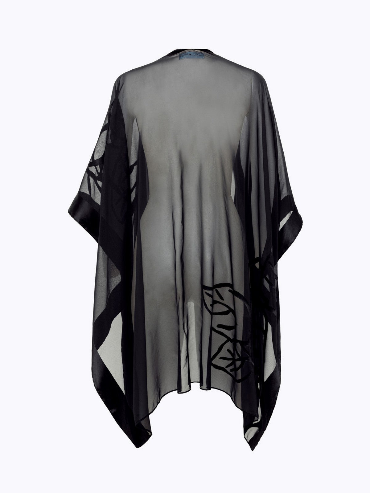 ? Devoré fabric with placed roses and logo.