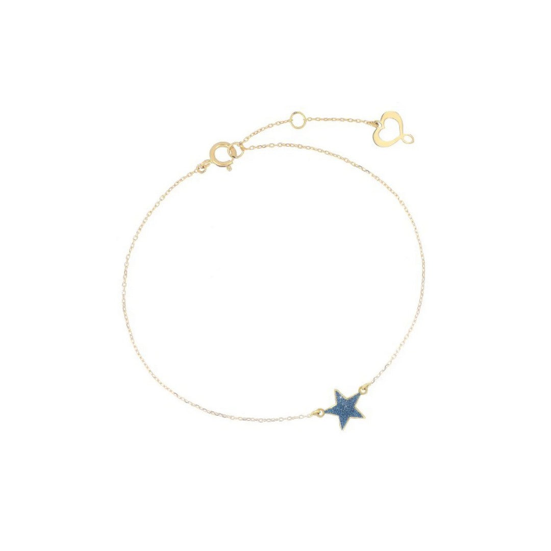 Chain bracelet from the Maman et Sophie Aurum Blue Powder collection for women. Color: gold and blue. The piece is crafted from 18kt yellow gold and features a central 7 x 7 mm blue diamond powder star. The end of the bracelet features an openwork Maman heart. Lobster clasp closure.
