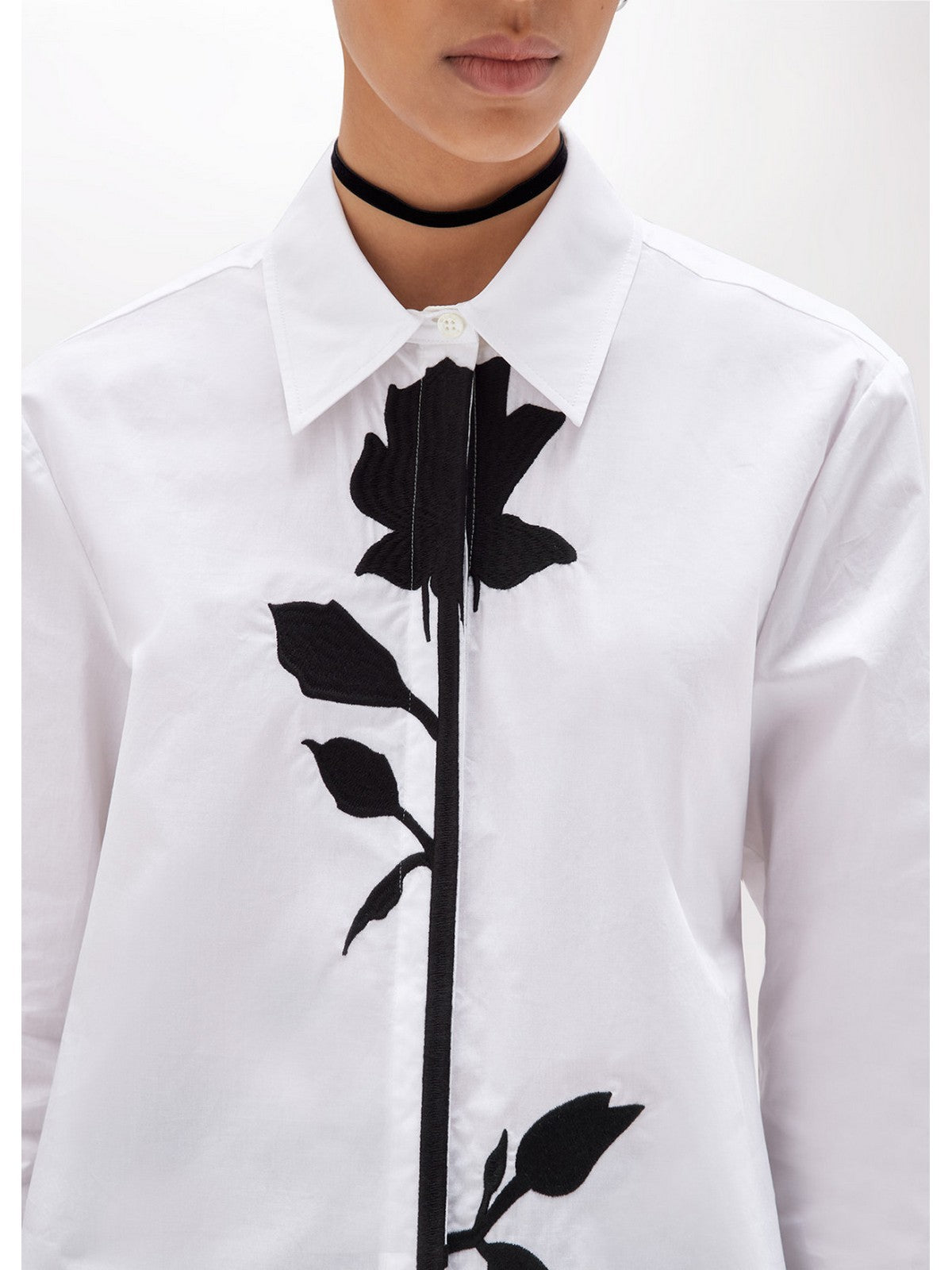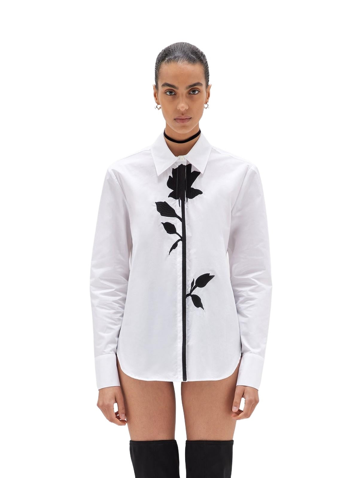 A jewel-like shirt that feels like a piece of jewelry thanks to its floral patch with beaded embroidery. It features a classic collar, hidden button closure, long sleeves, buttoned cuffs, and a regular fit. A touch of glamour for your special outfits. Composition: 100% cotton