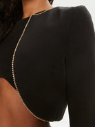Chaqueta cropped de LIU JO en color liso con pedrería aplicada en los bajos. Cuello redondo y manga 3/4. Sin cierre.