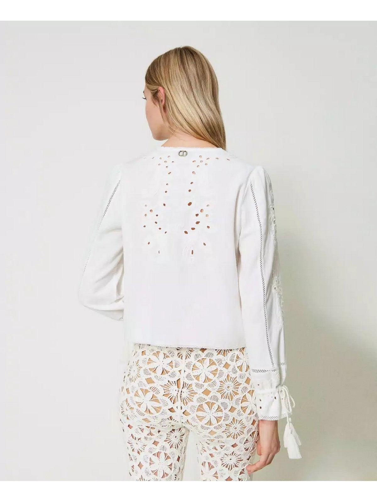 Chaqueta TWINSET de muselina de algodón y lino, decorada con bordados colocados. Cuello redondo y manga 3/4 con cintas torchon hechas a mano con terminaciones de borlas. Cierre con cordón. Placa con logo T ovalada en la parte trasera.