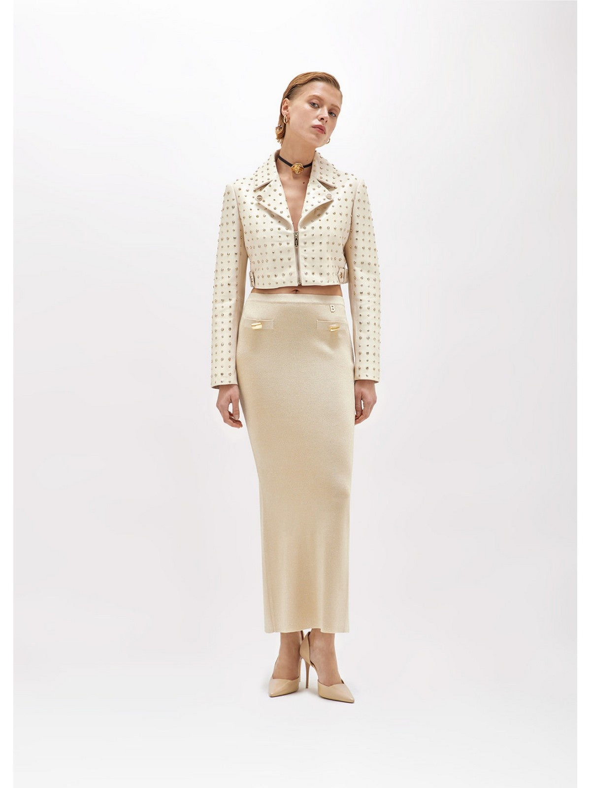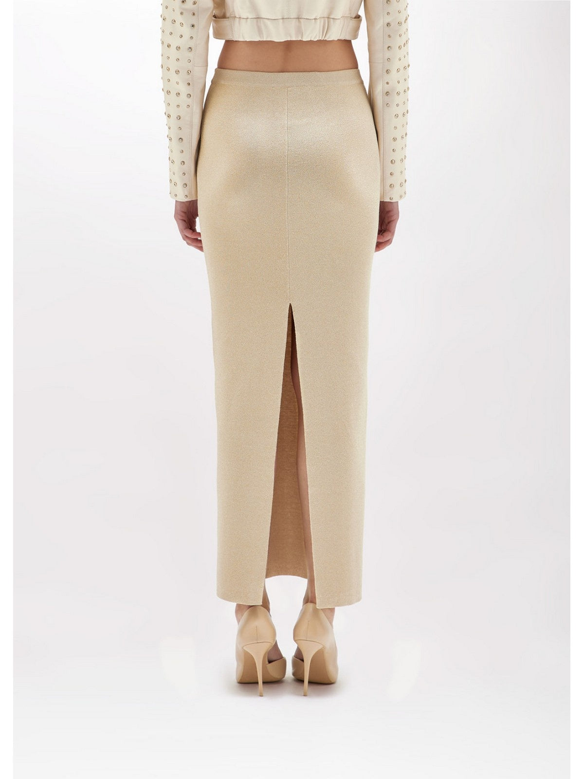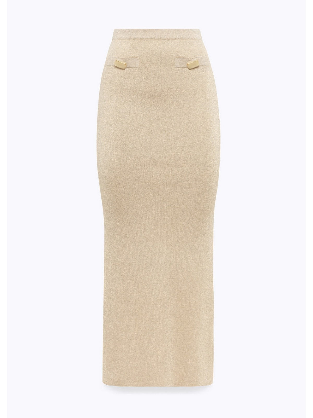 A CLEAN AND GLAMOURFUL DESIGN FOR THIS LONG SKIRT IN LUREX VISCOSE KNIT EMBELLISHED WITH JEWEL BUTTONS ON THE FLAP. It is crafted in a plain knit fabric and features an elastic waistband, a slit at the back, and a pencil-style, fitted silhouette. The perfect choice for completing your style for special occasions and on-duty wear. Composition: 57% VISCOSE 27% METALLIC POLYESTER 16% POLYESTER
