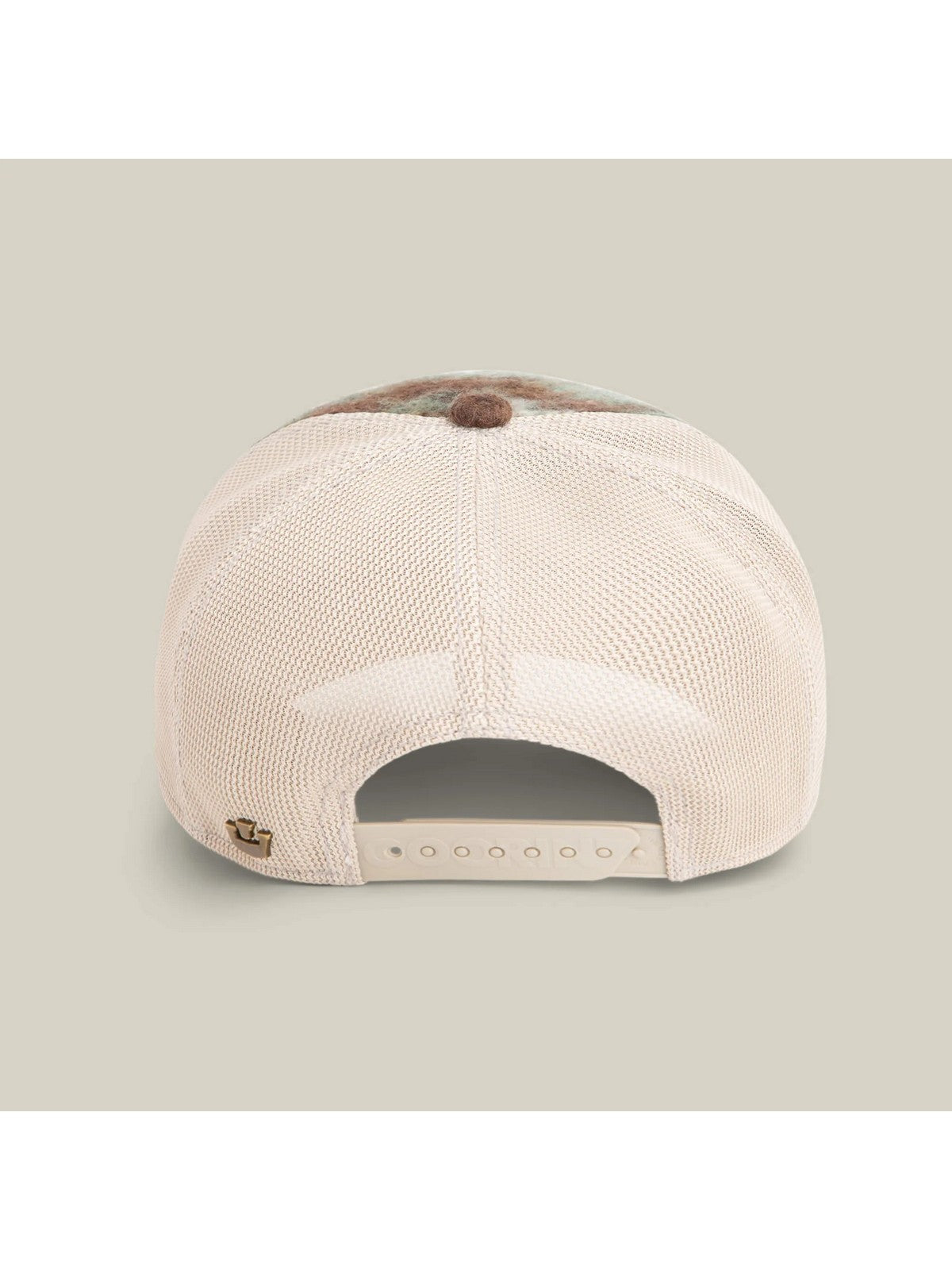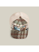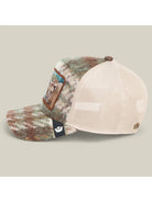 Cappello GOORIN BROSS in Plaid di lana in tonalità mimetiche con una toppa con motivo grizzly, sul fronte.