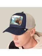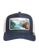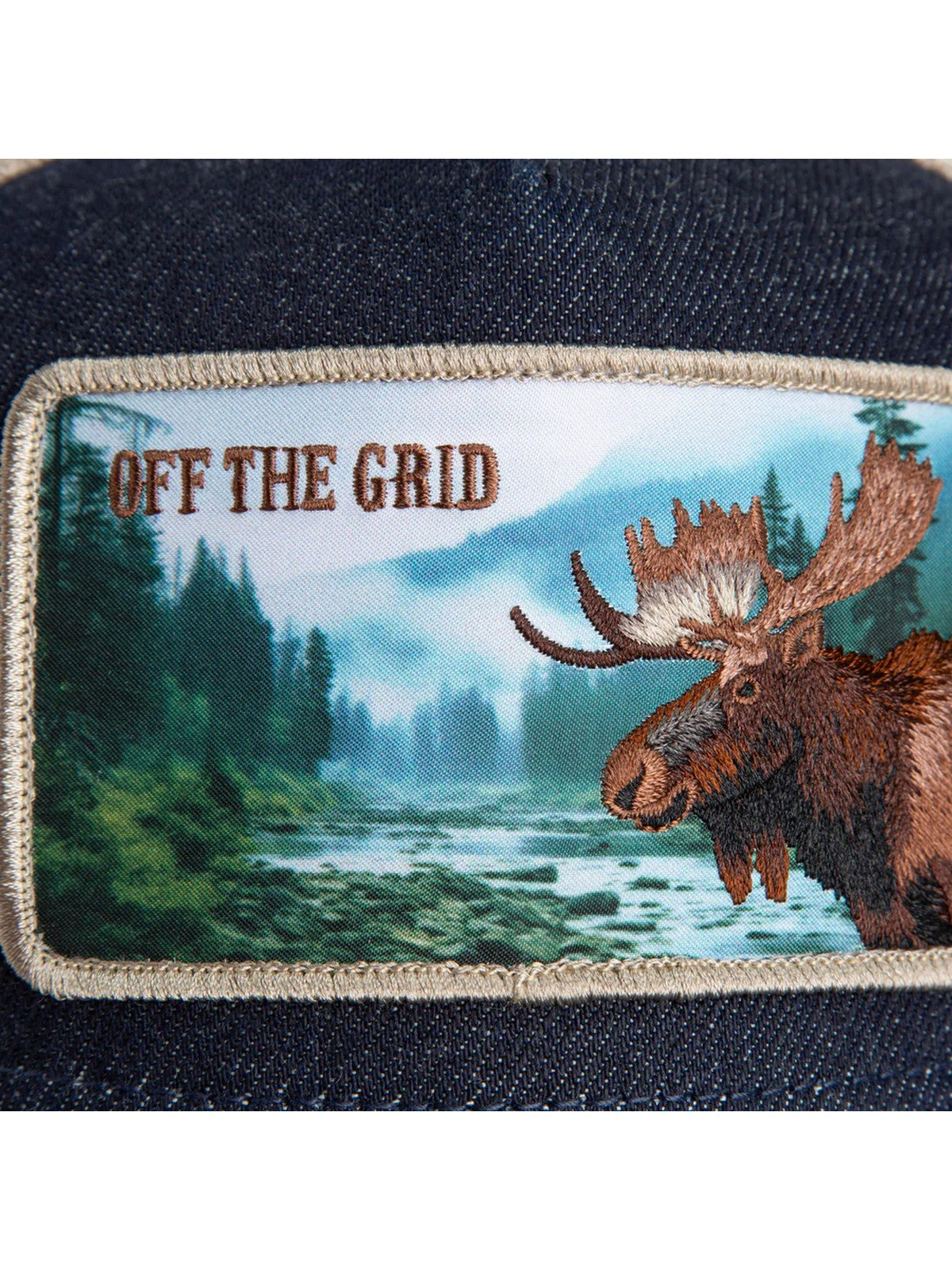 Cappello GOORIN BROSS Corona in denim, rete neutra e una toppa con un alce che vaga senza meta.