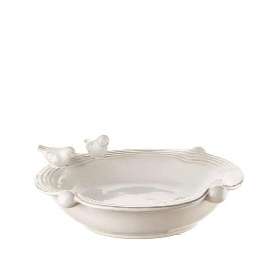Centerpiece with delicate ceramic birds. The delicate relief decoration and the antique effect make it the missing detail of an elegant and welcoming decor. To be combined with the Modern Country inspired centerpiece cup to embellish convivial environments.
