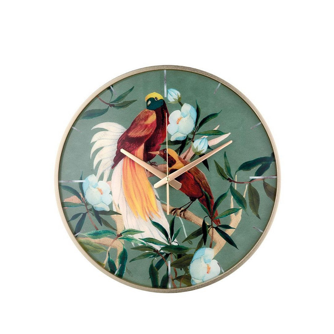 Orologio da parete in vetro decorato e resina dall'originale decoro con Uccelli del Paradiso Per ambienti dal design ricercato.