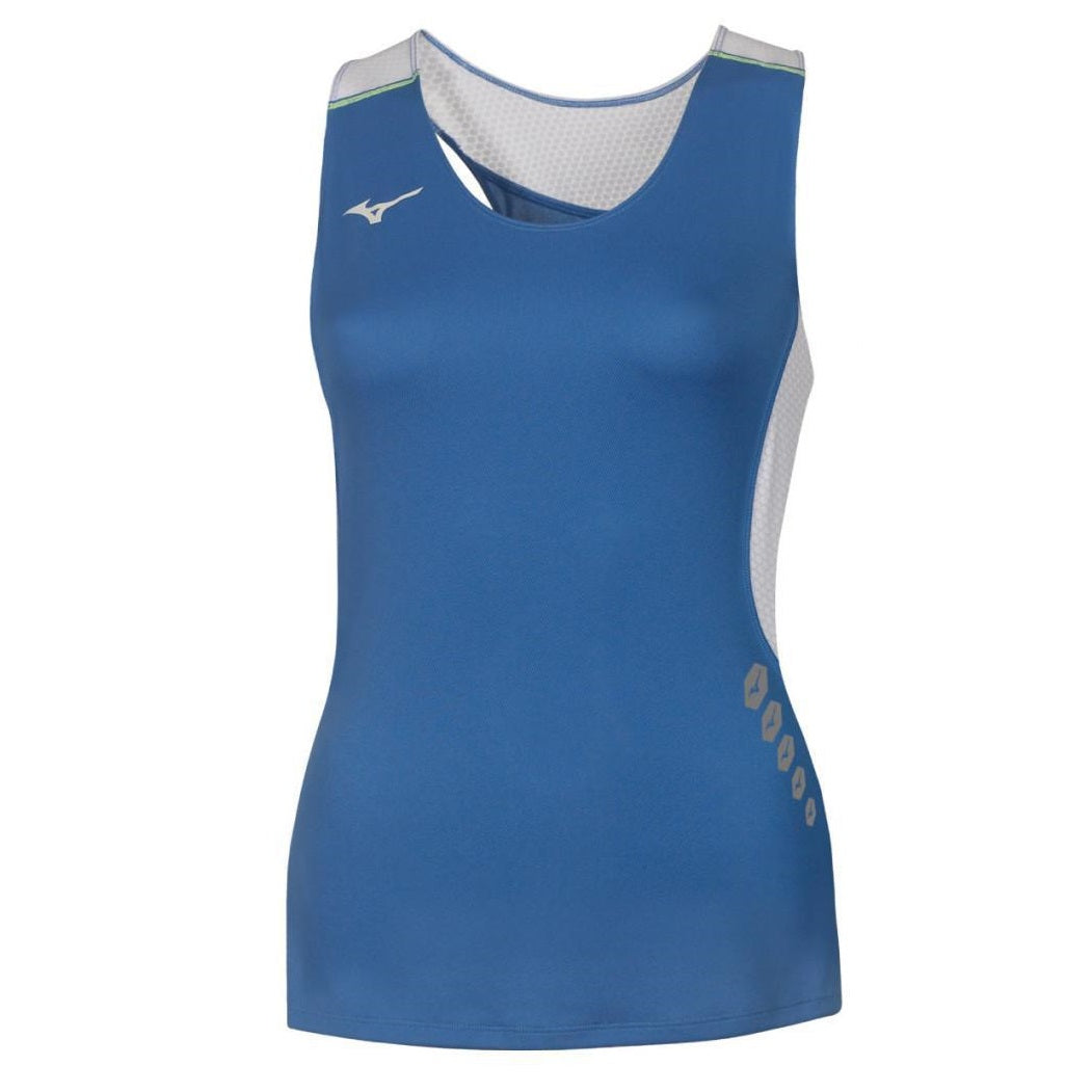 Mizuno women's running tank top. Mizuno running tank top in lightweight, breathable fabric with Mizuno DRYLITE® technology, jacquard mesh on the side for improved performance, Hex Runbird print, and contrasting neon details. Salbini, technical sportswear.