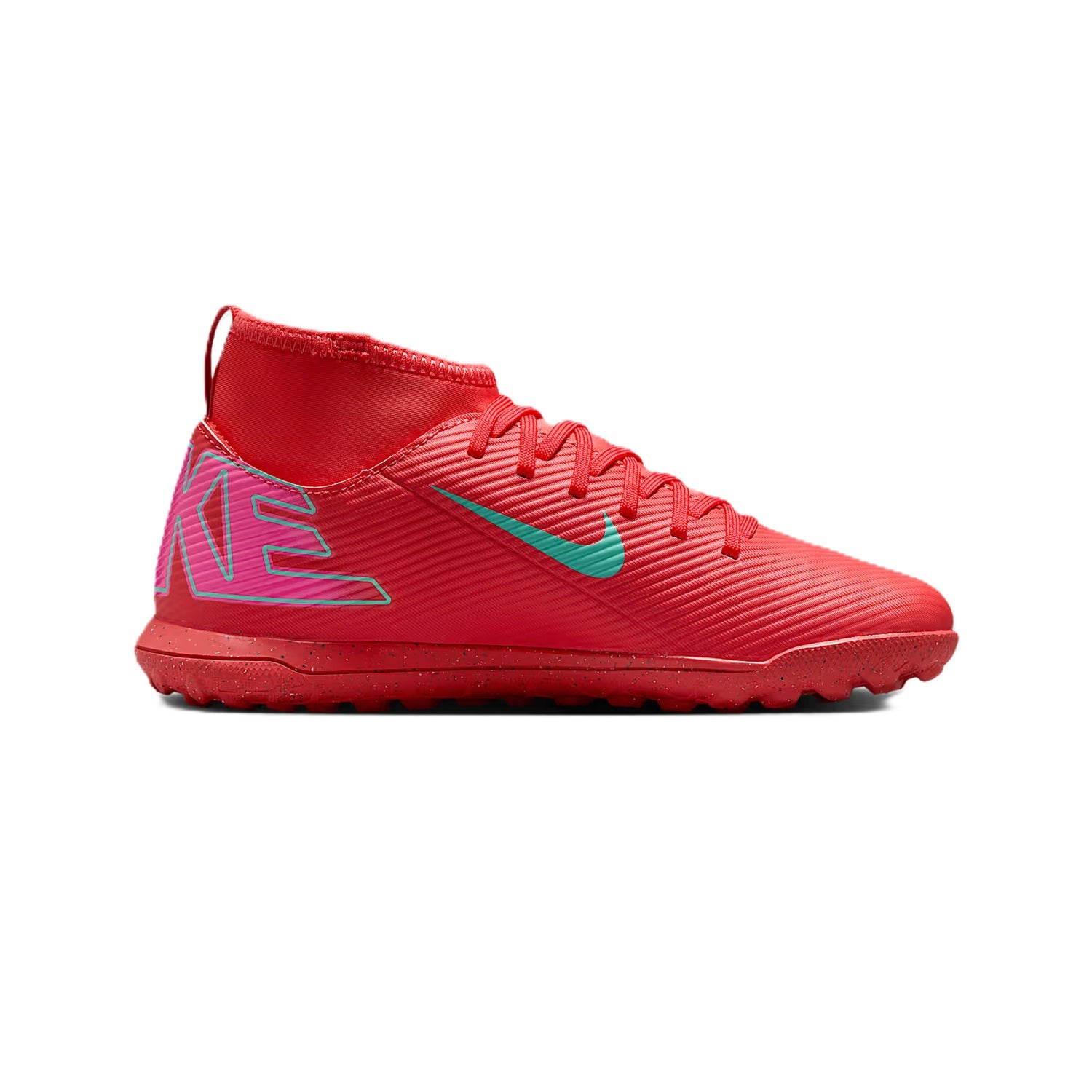 Nike Mercurial Superfly 10 Club TF kids' soccer cleats. The soft-touch synthetic leather upper features small textured details that provide grip for better ball control during high-speed dribbling. Quick traction thanks to the durable rubber tread that offers greater traction on synthetic grass surfaces. Optimal fit with the comfortable lining that wraps the foot for a natural and snug fit. Classic laces, ideal for shorter synthetic surfaces, cushioned insole. Salbini technical sports articles is a Nike retailer.