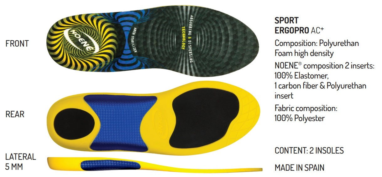 The 3D INSOLE ERGOPRO AC+ insoles feature a Memory Foam structure that adapts perfectly to the shape of the foot while maintaining its properties and initial ergonomic shape. They protect with 2 noene ® inserts with a thickness of 2 mm, positioned in the areas of greatest pressure of the foot. The Soft Effect layer (yellow) evenly distributes the load of the foot for high comfort. The insert under the arch (blue) guides and stabilizes the foot. They are covered in breathable and antibacterial fabric. The Noene Ergopro AC+ are ideal for all athletes who practice endurance sports, replacing the original insole (3D-insole). The package contains 2 insoles. Salbini articoli tecnici per lo sport is an official reseller of Noene insoles.