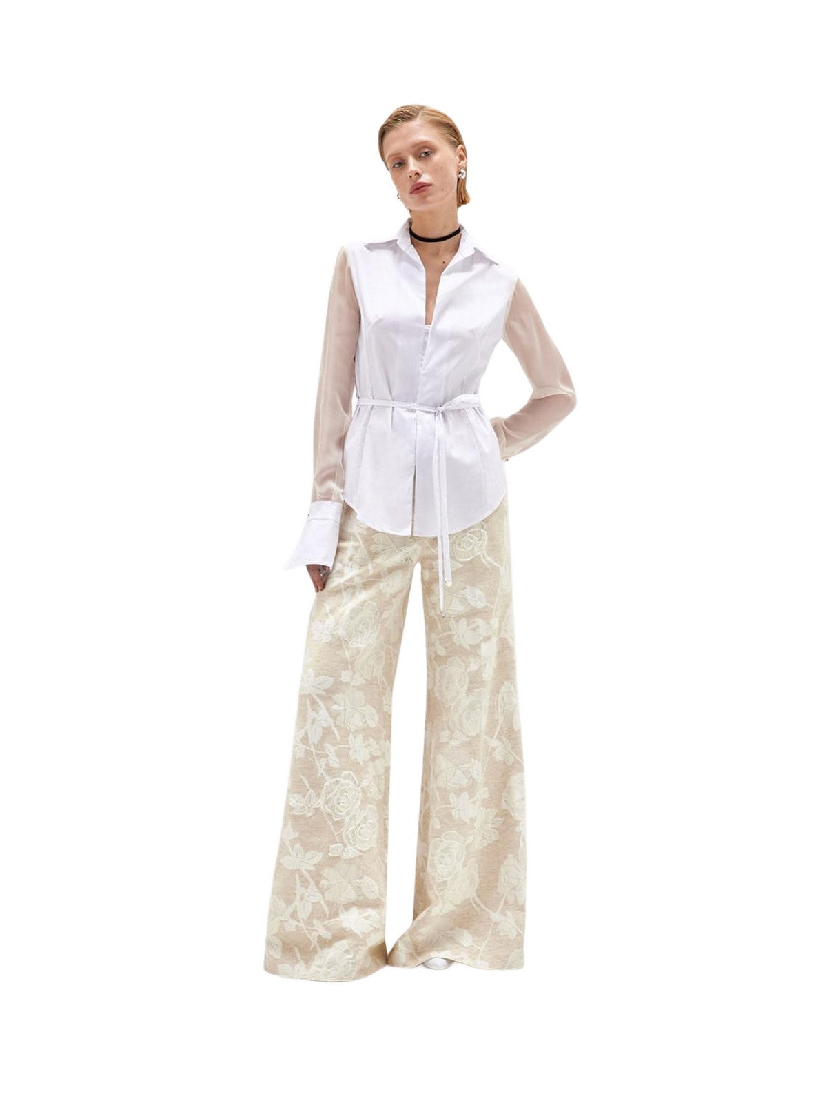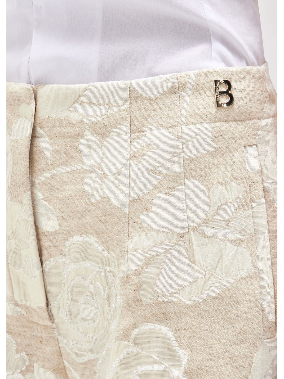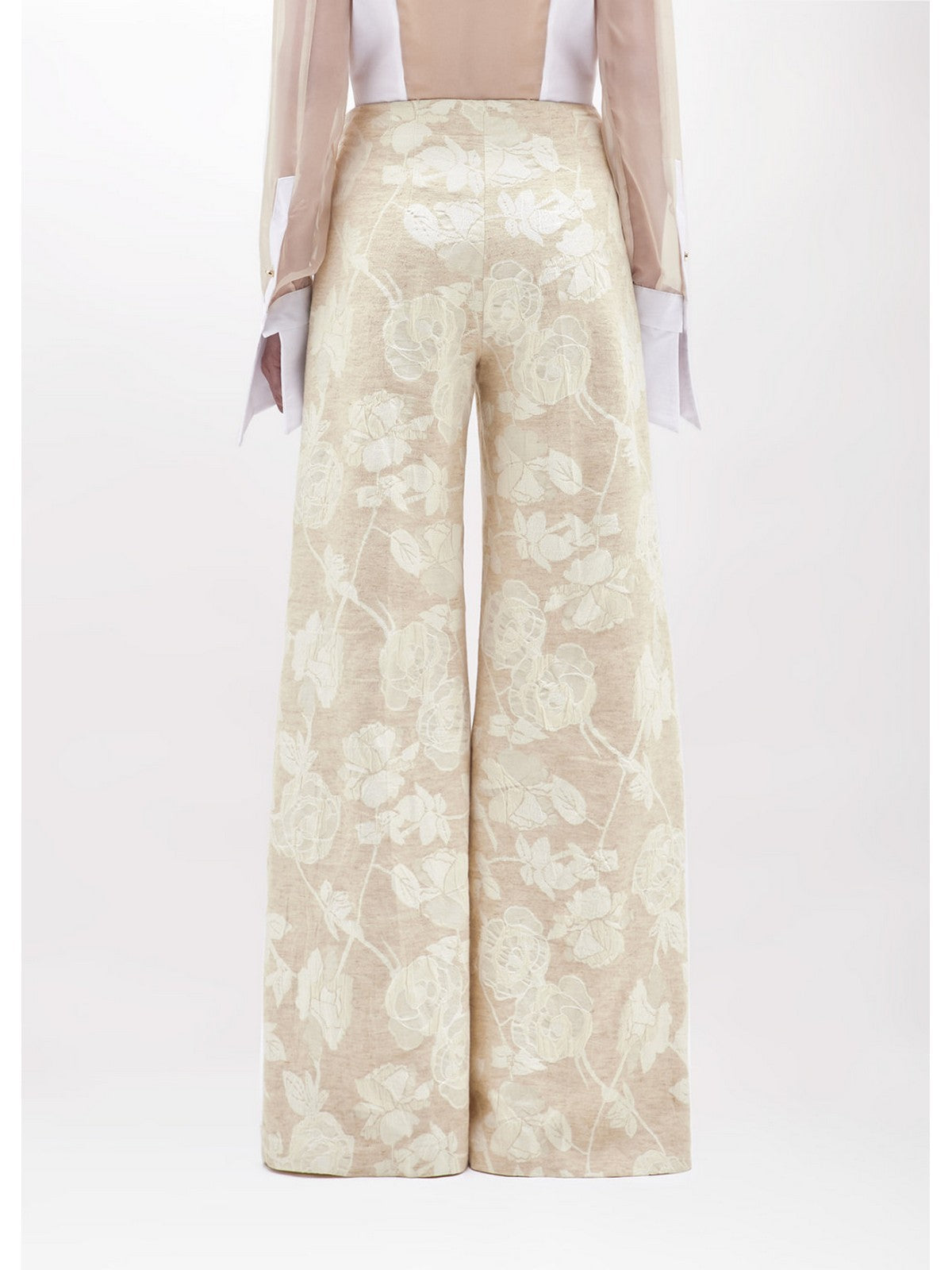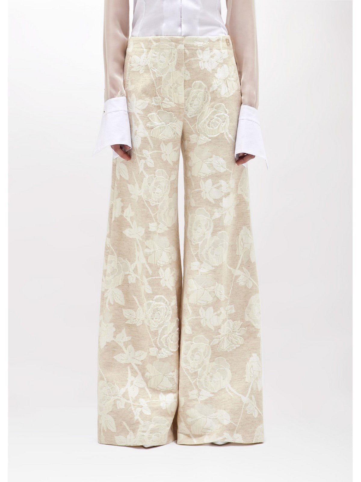 ELEVATE YOUR STYLE WITH THESE FLORAL JACQUARD TROUSERS WITH TONE-ON-TONE BEAD EMBROIDERY. THEY HAVE A FLARED FIT, DARTS AT THE WAIST, A ZIP AND HOOK CLOSURE, AND WELT POCKETS AT THE HIP. COMPLETE THEM WITH THE MATCHING JACKET OR VEST FOR A FLORAL SUIT THAT WILL CATCH EYES. COMPOSITION: 63% COTTON 27% VISCOSE 10% LINEN
