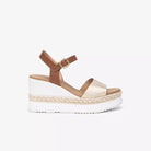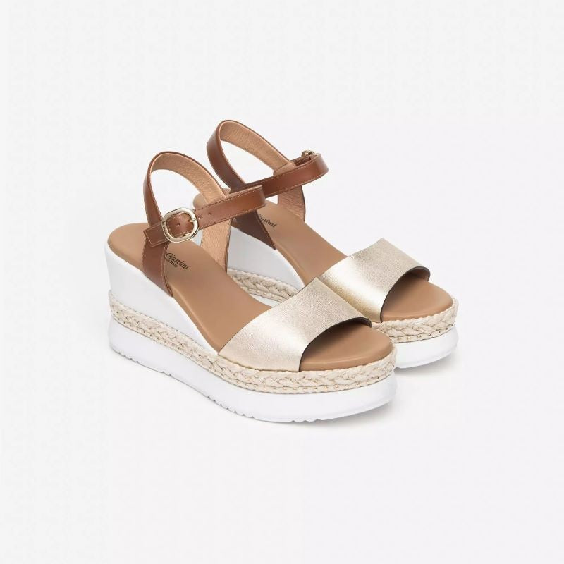 Nero Giardini women's sandal featuring an 8.5-9 cm wedge heel with a 3-4 cm platform. Crafted from multicolored leather, it features a metallic gold-tone front band and a honey/cognac leather ankle strap. The closure is with an elegant gold-tone buckle. The padded leather lining and insole ensure all-day comfort, while the rubber sole ensures grip and durability.