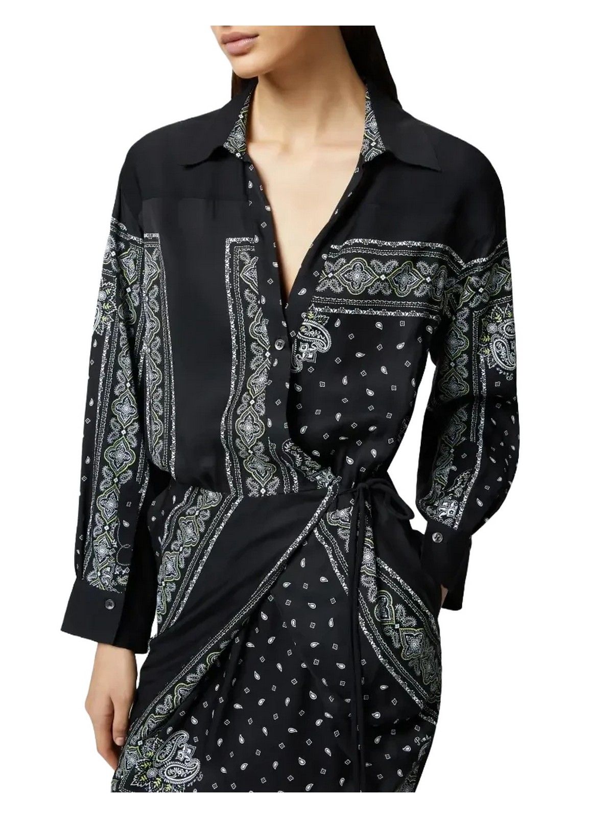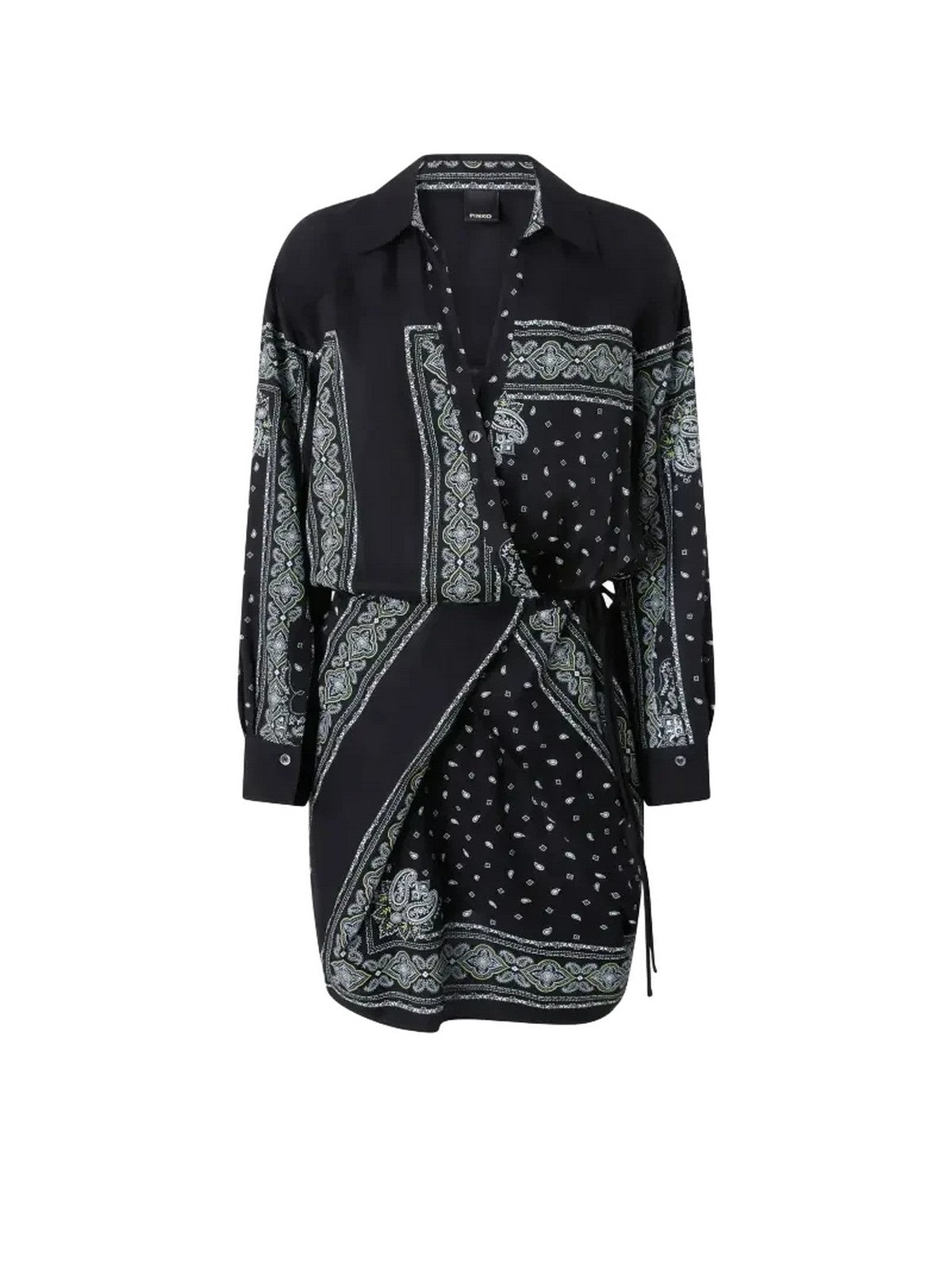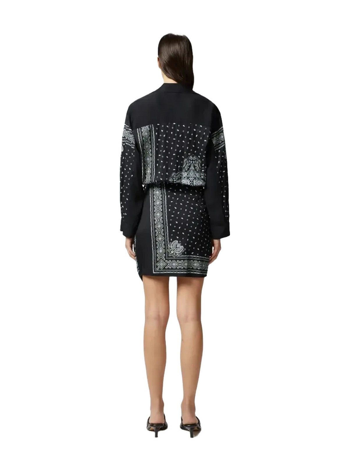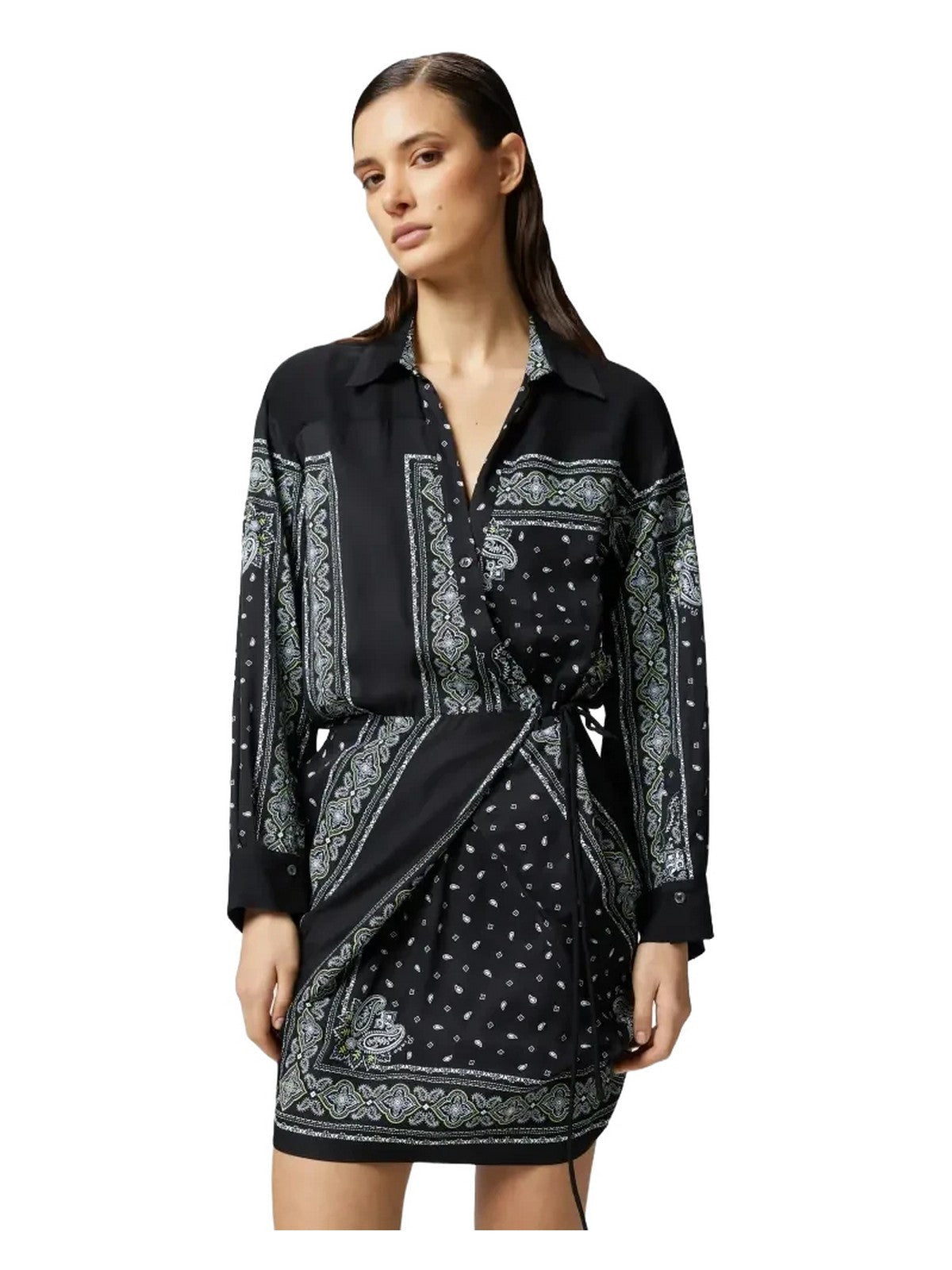Short shirt-style dress made of viscose twill with a paisley bandana print and lightweight viscose georgette inserts. This mini shirtdress mimics a wrap-around look, with the shirt crossing at the top and the short skirt with side pockets crossing at the front, closing with a side tie. The classic shirt collar is complemented by a V-neck for an added feminine touch, making this summer dress feel like you're on vacation even when you're on your way to work.