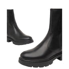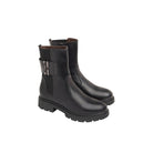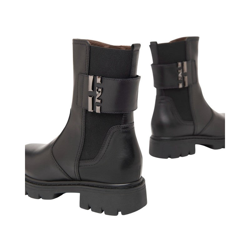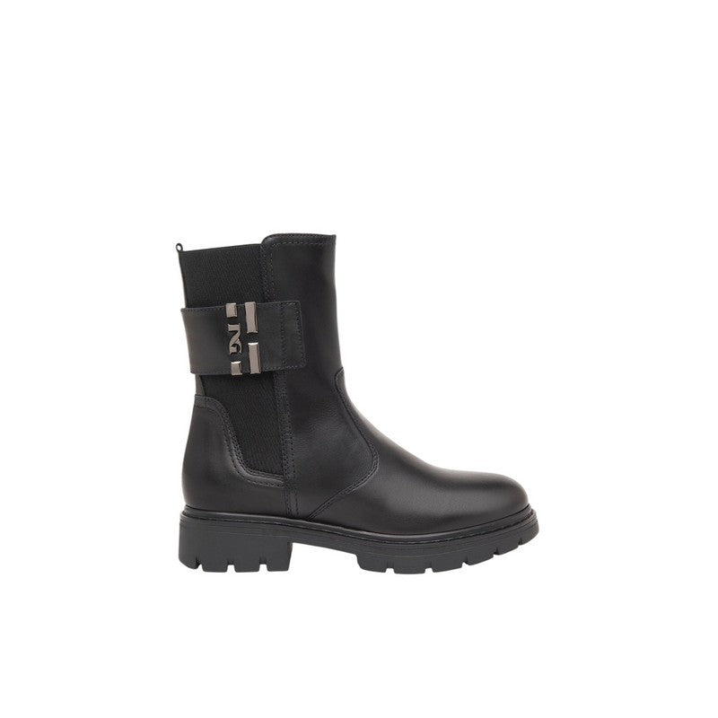 Bottines en cuir noir signées NeroGiardini, au style audacieux et moderne. Leur design épuré est sublimé par un empiècement latéral élastique et une bride emblématique ornée d'une boucle décorative en métal ornée du logo NG, apportant une touche de chic urbain à ce modèle pratique et polyvalent.