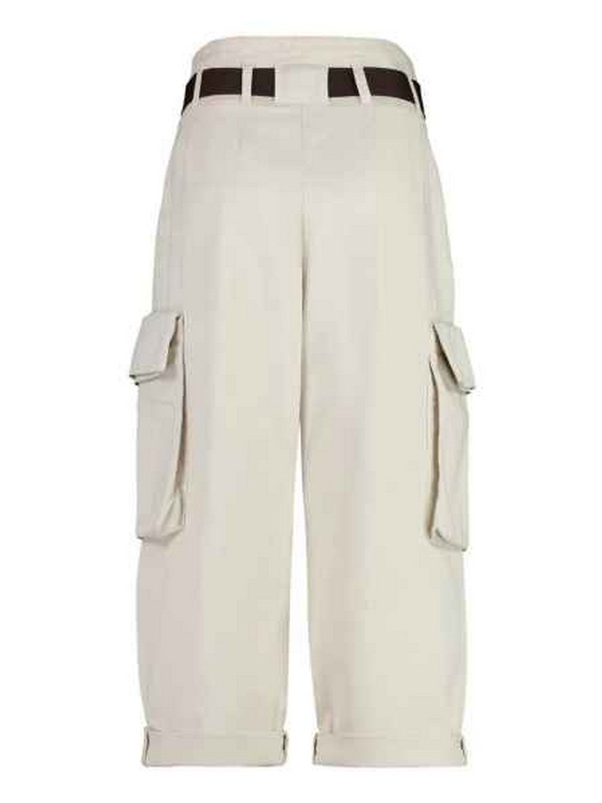Pantalon femme à silhouette cargo oversize en gabardine teinte. Taille pochette très haute, avec des plis qui soulignent les lignes, complétée par une ceinture assortie à nouer. Jambe large, poches à rabat en pointe sur les côtés et grandes poches utilitaires à soufflet sur les côtés. Fermeture zippée et boutonnée.
