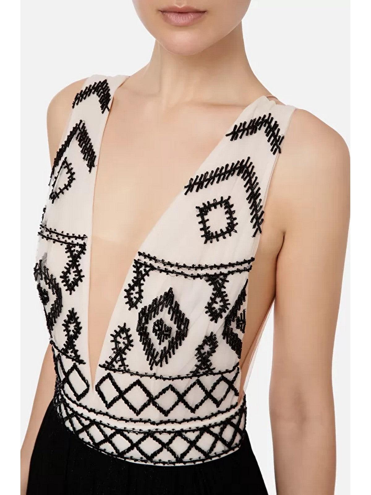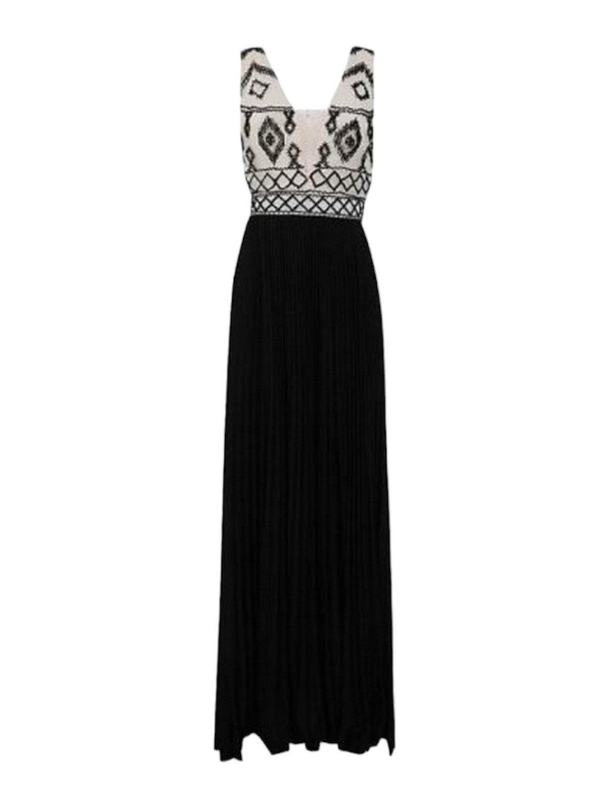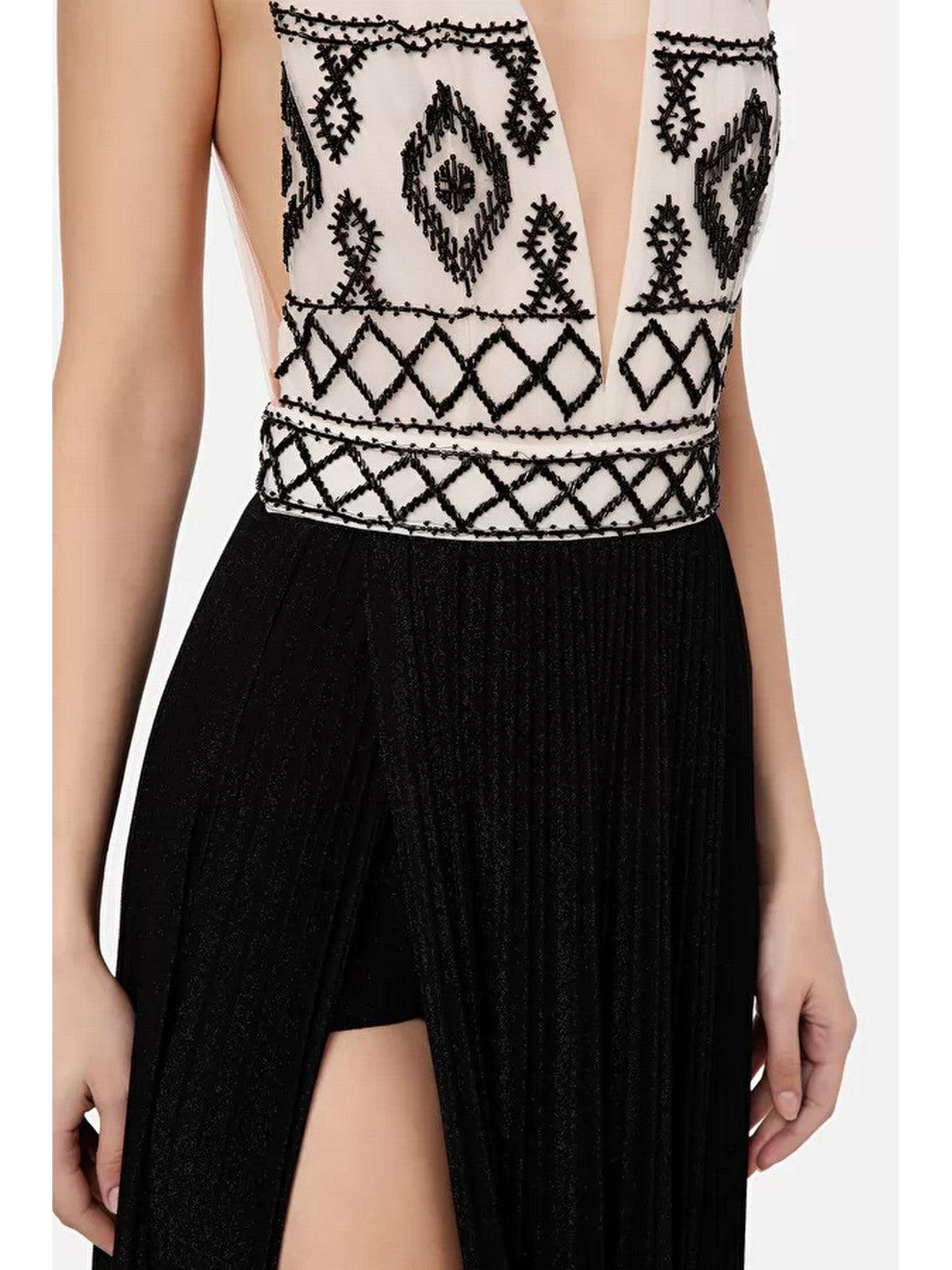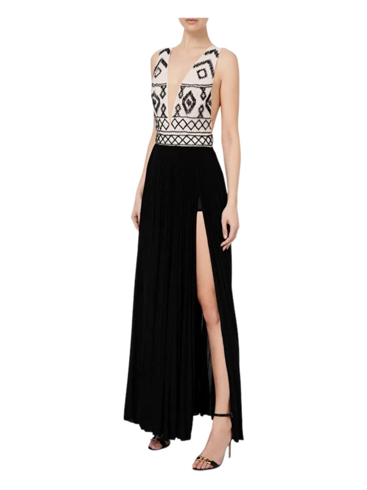 Abito lungo ELISABETTA FRANCHI in misto viscosa. Profonda scollatura e coppe ricamate con perline disegno rombo, schiena scoperta. La gonna plissettata, in jersey lurex, presenta due spacchi profondi.
