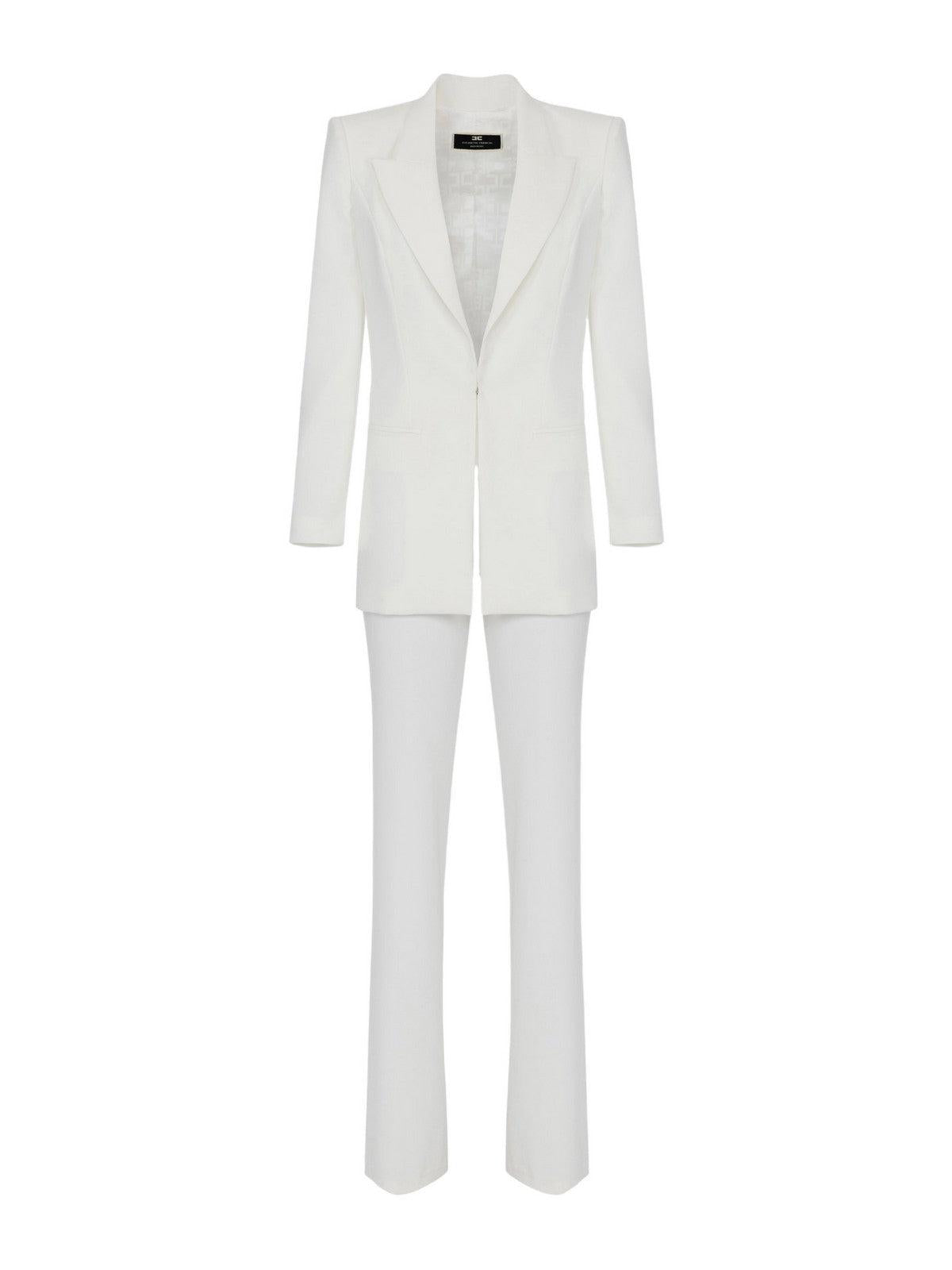 Tailleur ELISABETTA FRANCHI in crêpe fluido composto da giacca con spalle strutturate e collo a lancia, chiusura monopetto con gancio. Pantalone svasato al fondo grazie all'inserto in voile sulle gambe, vita alta. Chiusura con zip invisibile.