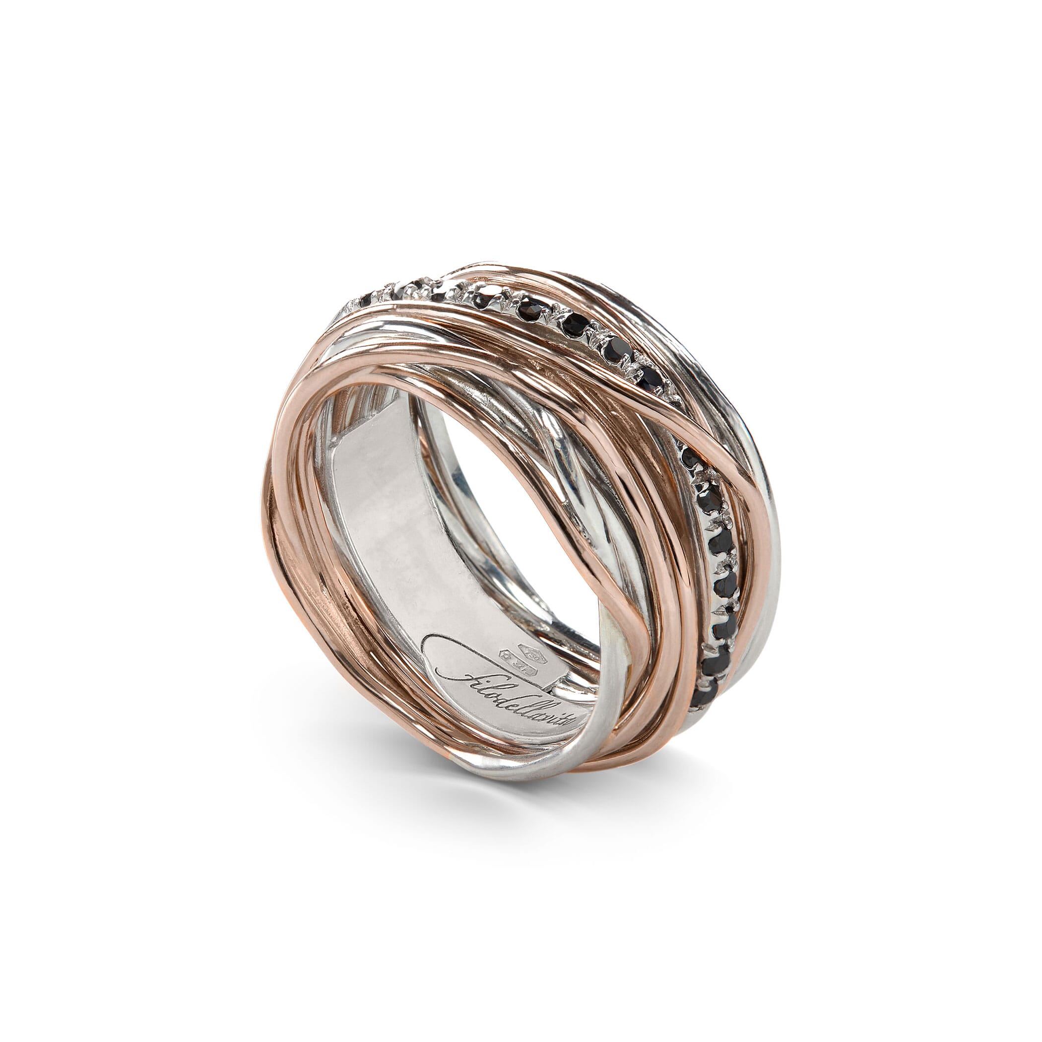 Anello Filodellavita Classic Collection, 13 Fili in Oro Rosa 9kt, Argento .925 e 16 Diamanti Black 0.21 ct