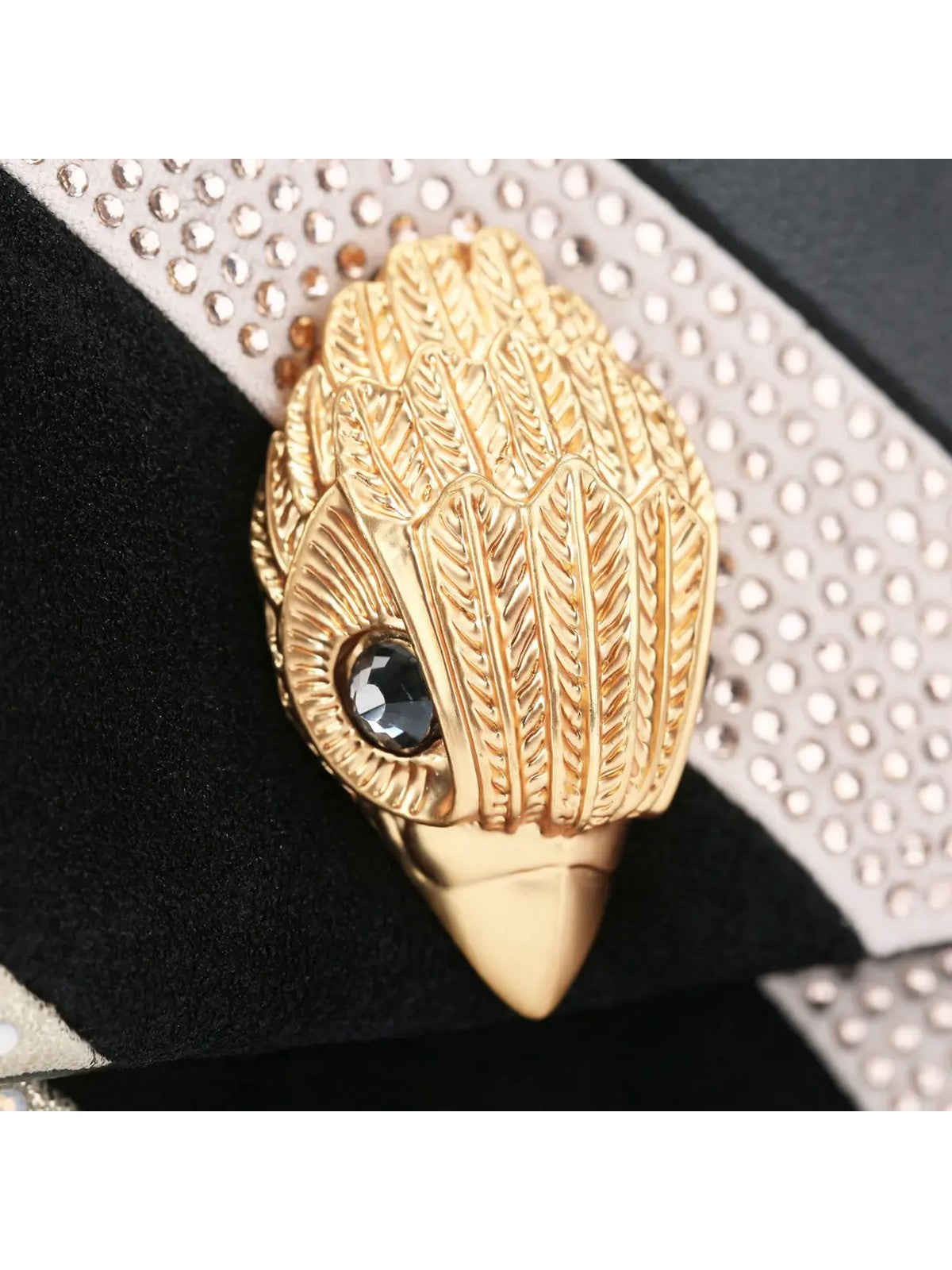 Borsa KURT GEIGER Mini Kensington realizzata in pelle bianca e nera con motivo a onde e dettagli impreziositi da cristalli. La testa d'aquila in oro spazzolato è posizionata sulla patta frontale.