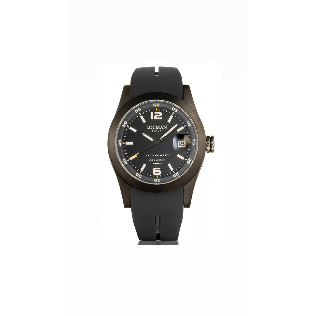 Orologio automatico Locman da uomo della linea Island con nuovo quadrante nero a due livelli e secondiera, cassa in acciaio da 40mm con trattamento PVD nero e cinturino in silicone abbinato, vetro zaffiro, fondello in titanio,  impermeabile 5 bar. movimento solo tempo con datario. cod 0615K01S-BKBKWHSK