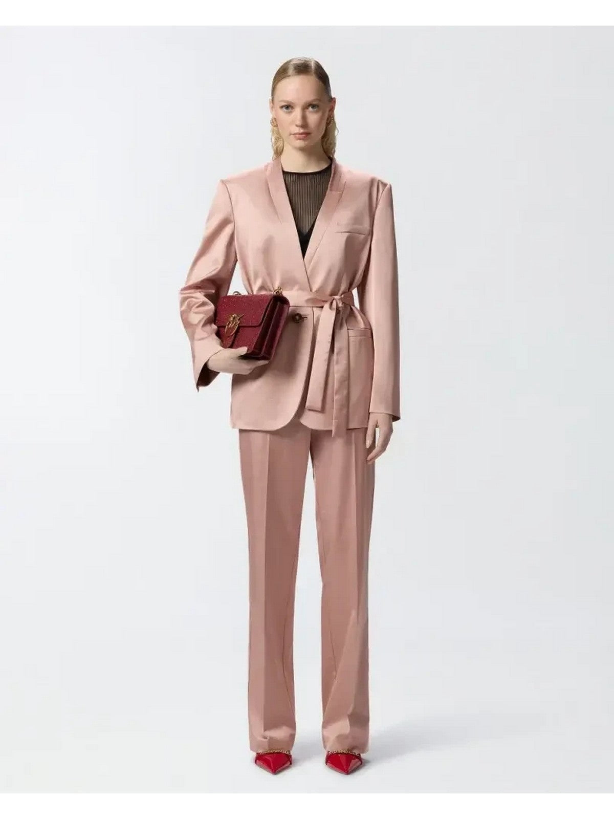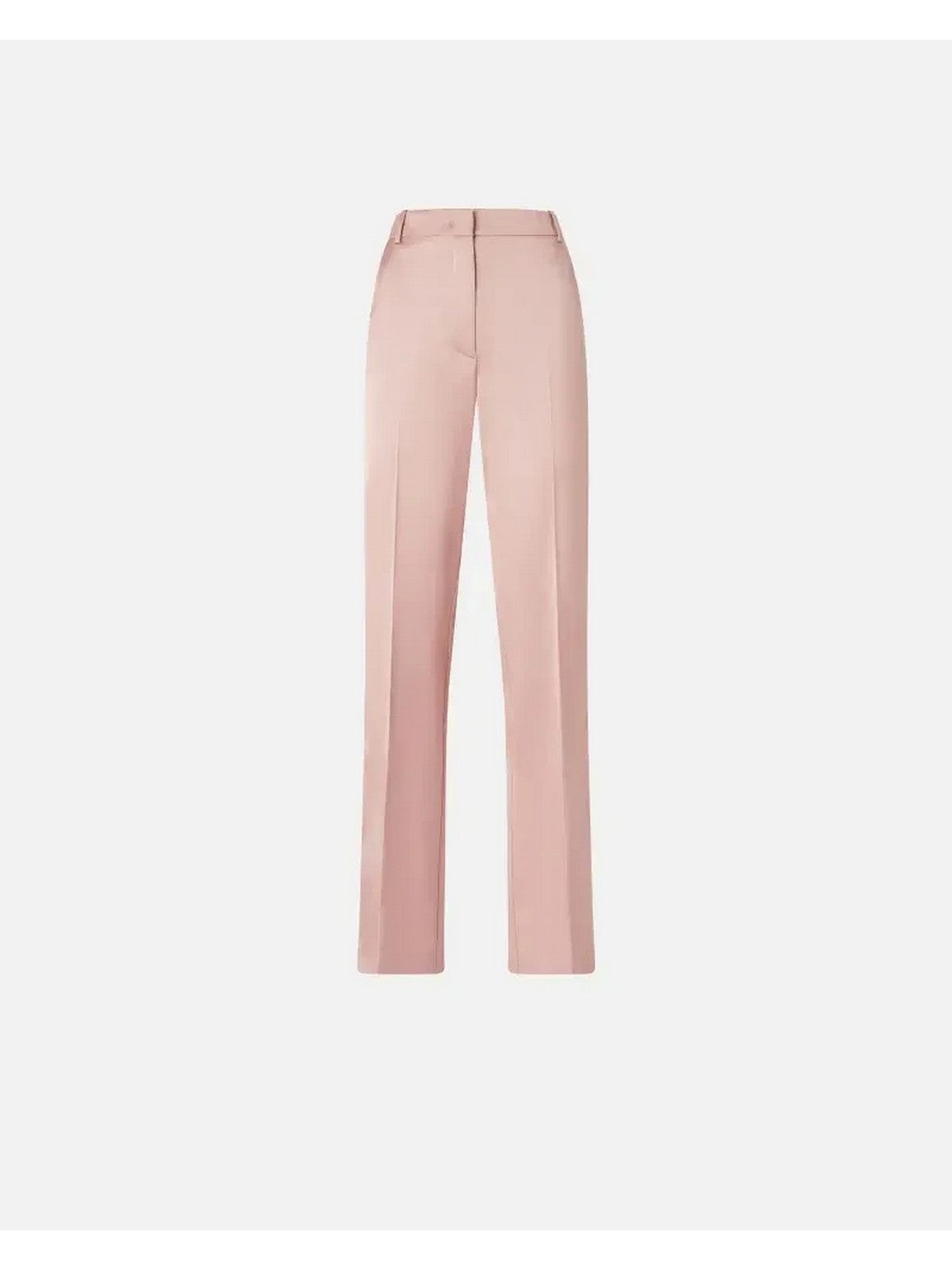 Pantaloni lunghi eleganti da donna in lucido raso di cotone e viscosa stretch dalla particolare lavorazione fiammata, che conferisce alla texture del capo una mano irregolare, quasi artigianale. I pantaloni da cerimonia sono caratterizzati da una gamba dritta, leggermente ampia, completata da piega centrale sia davanti che sul retro, che aggiunge un tocco di sartorialità e un dettaglio raffinato. La parte superiore dei pantaloni è rifinita con passanti per cintura, per personalizzare il tuo look, tasche alla francese sui fianchi e chiusura con zip coperta e gancio a uomo. Completa il tuo look per un'occasione speciale, matrimonio o festa indossando i pantaloni in raso con il blazer abbinato, stretto in vita con la cintura nello stesso tessuto, per un outfit femminile e perfetto per la stagione primaverile.