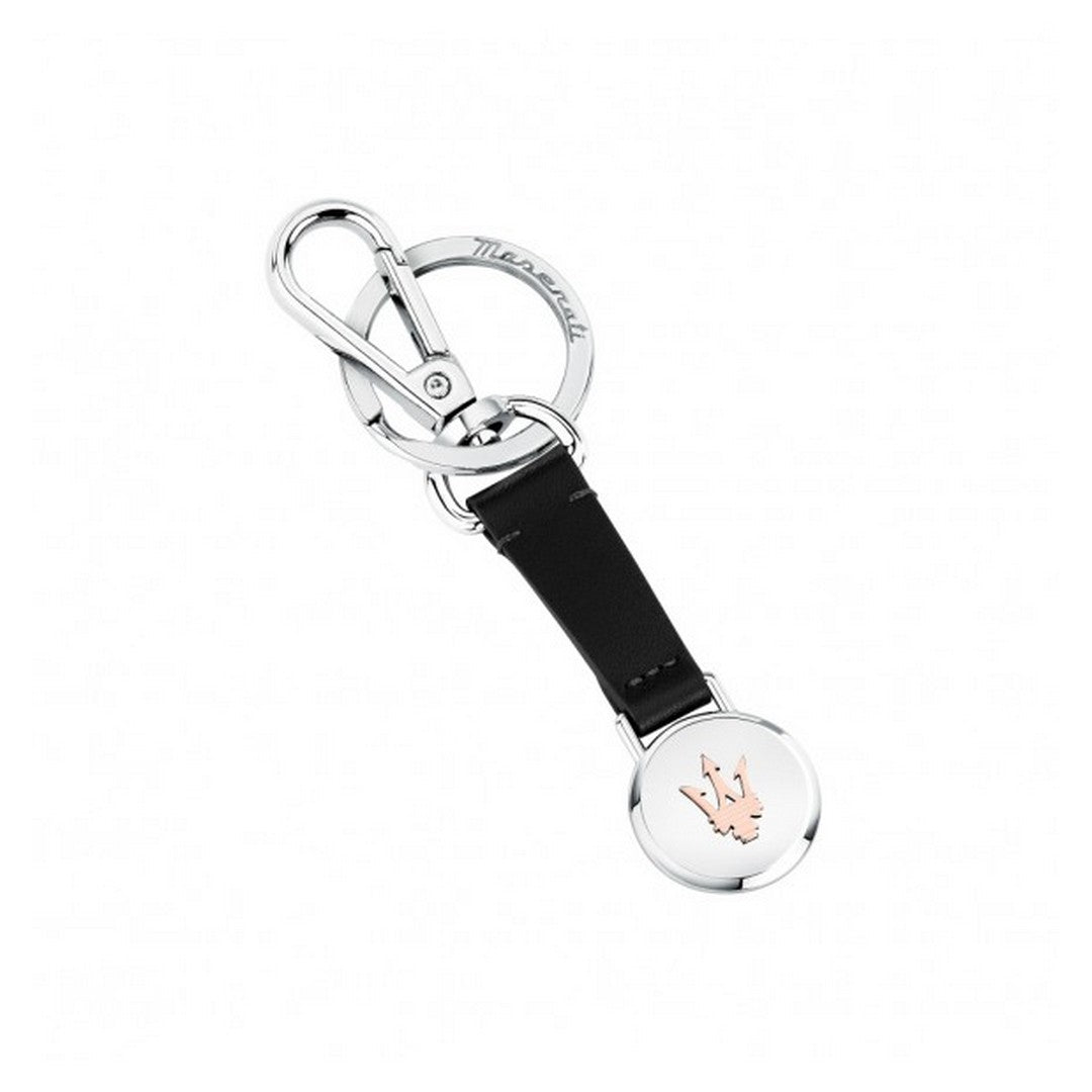 Portachiavi realizzato in pelle nera con pendente in acciaio anallergico logato.