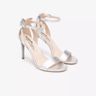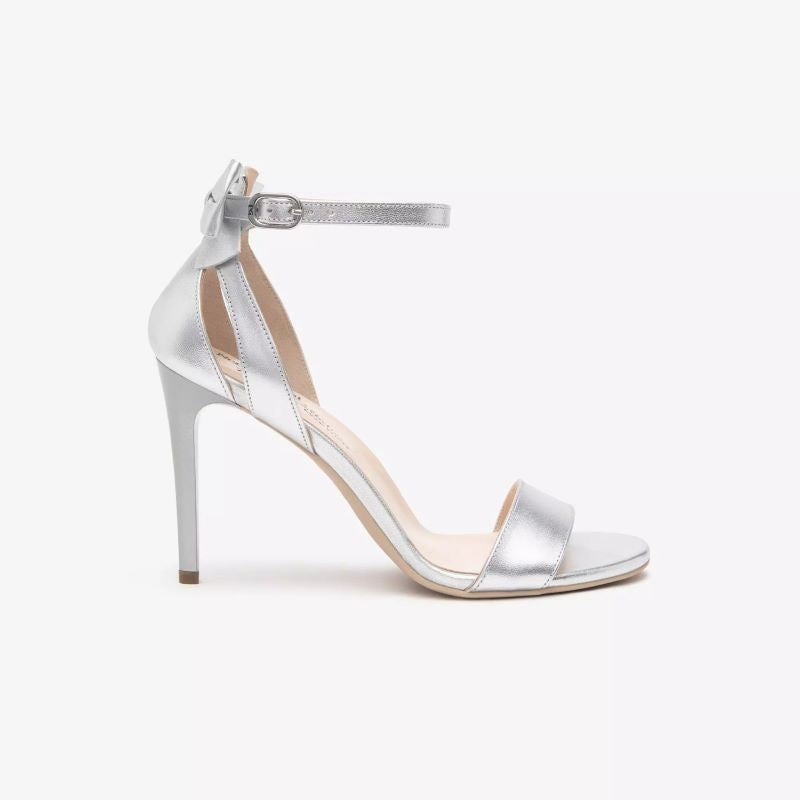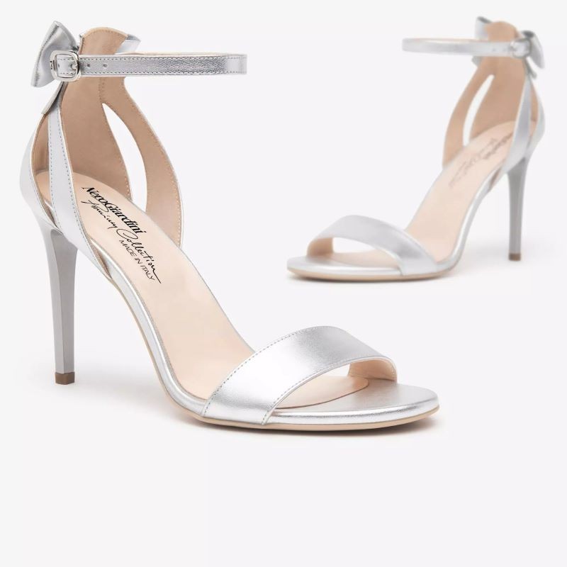 Sandalo da donna Nero Giardini in pelle laminata color argento, con cinturino regolabile alla caviglia e tacco alto da 10 cm che slancia la figura con eleganza. Interno in pelle per una calzata comoda e traspirante, suola in gomma antiscivolo per maggiore stabilità. Un modello raffinato e luminoso, ideale per cerimonie, serate estive ed eventi speciali. Qualità artigianale 100% Made in Italy.