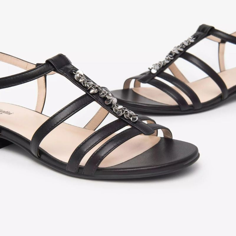 I sandali NeroGiardini, soprannominati "Pandora", combinano eleganza e comfort con uno stile versatile. Realizzati in pelle pieno fiore Made in Italy, presentano un design minimalista con fascia alla punta e cinturino laterale regolabile con fibbia, garantendo una calzata confortevole e stabile per tutta la giornata.