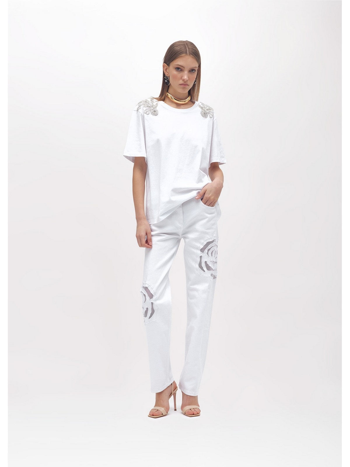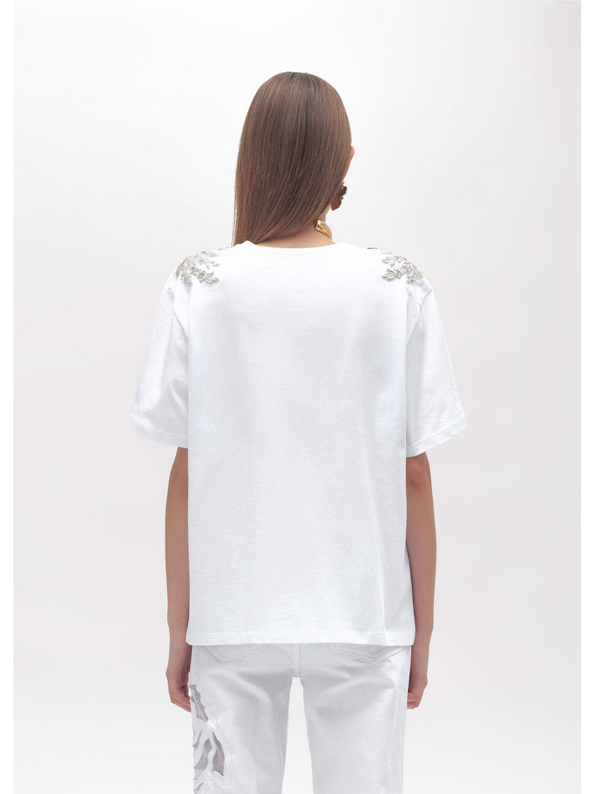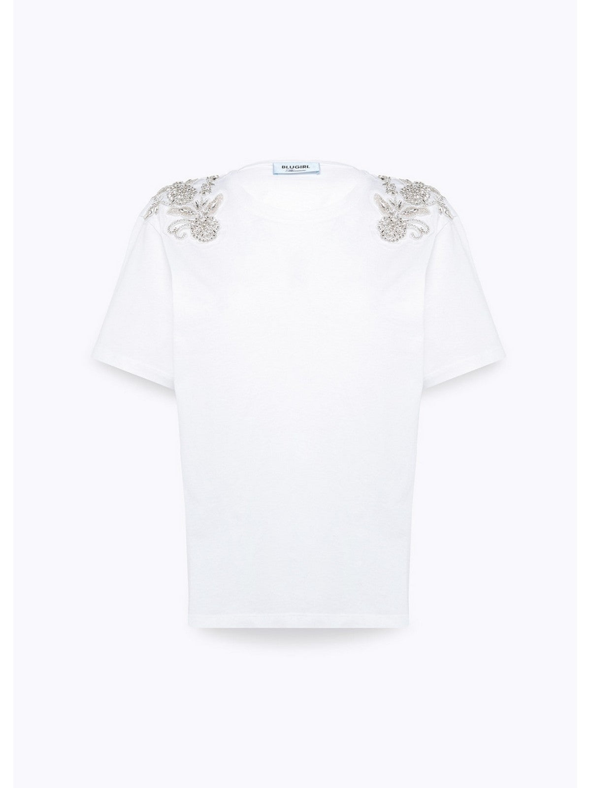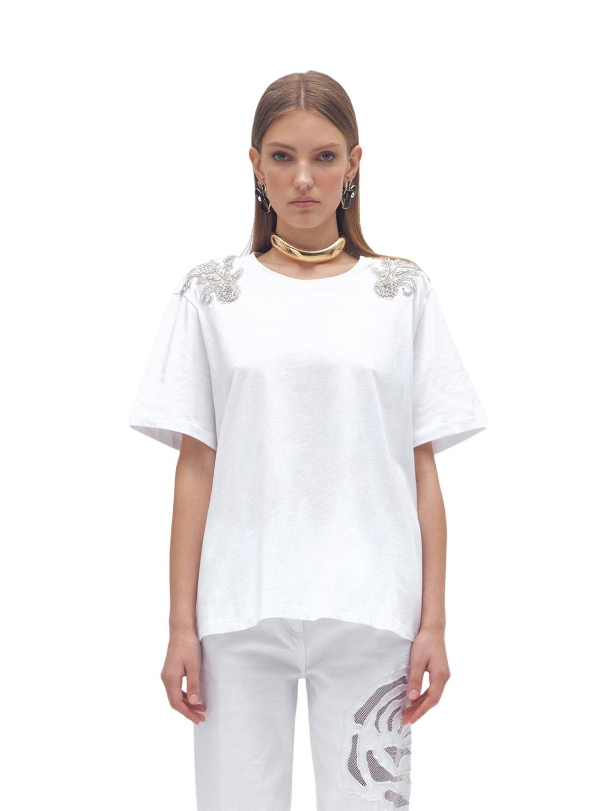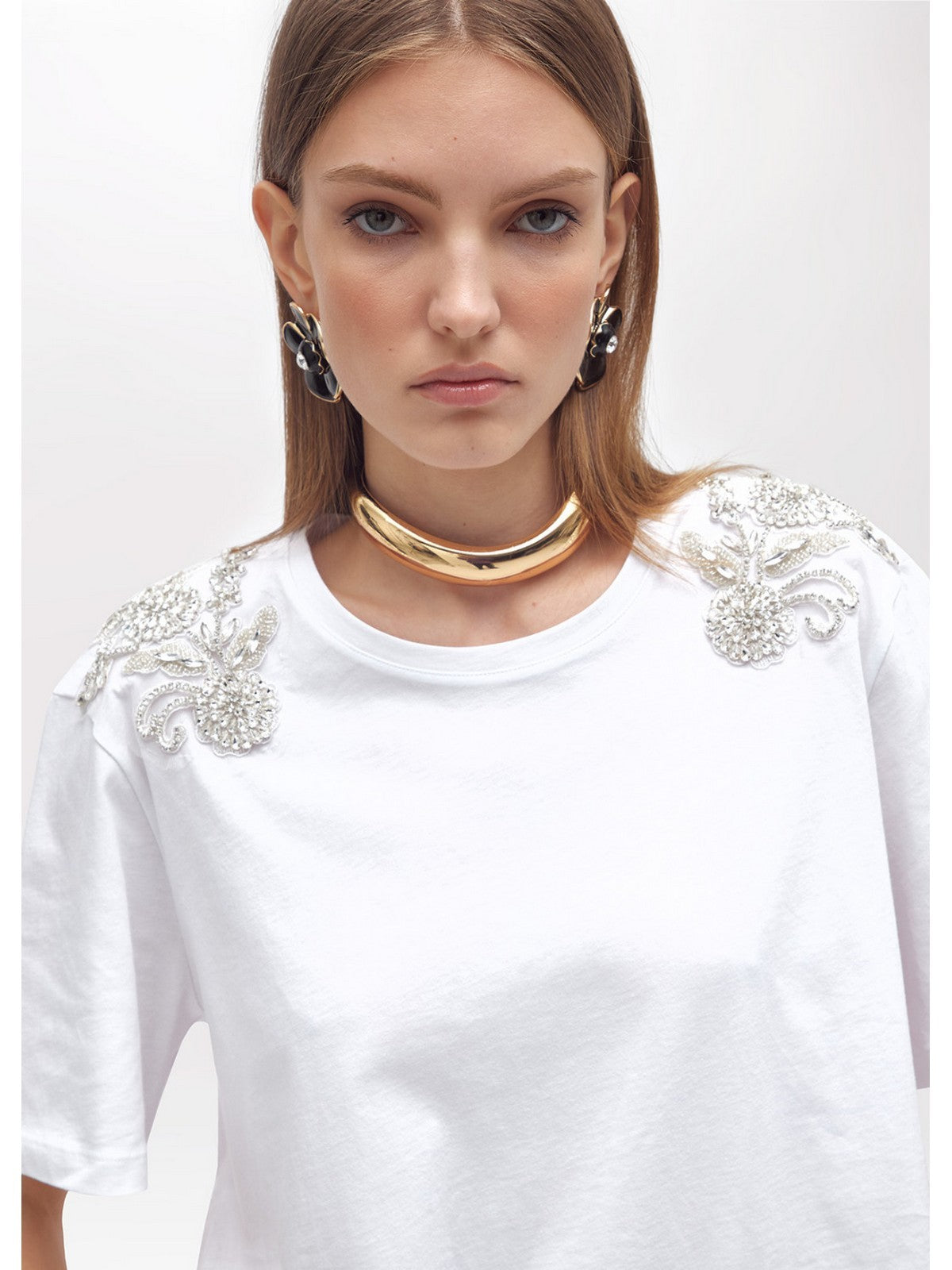 IL LATO GLAMOUR DELL'EASYWEAR: T-SHIRT IN JERSEY DI COTONE CON PATCH RICAMATI SULLE SPALLE CON PERLINE E CRISTALLI SU TULLE, COLLO TONDO, MANICHE CORTE CON SPALLE SCESE, LINEA REGULAR. PERFETTA PER ELEVARE TUTTI GLI OUTFIT CASUAL, MA ANCHE COME BASE DEI TUOI PARTY LOOK.COMPOSIZIONE: 100% COTONE