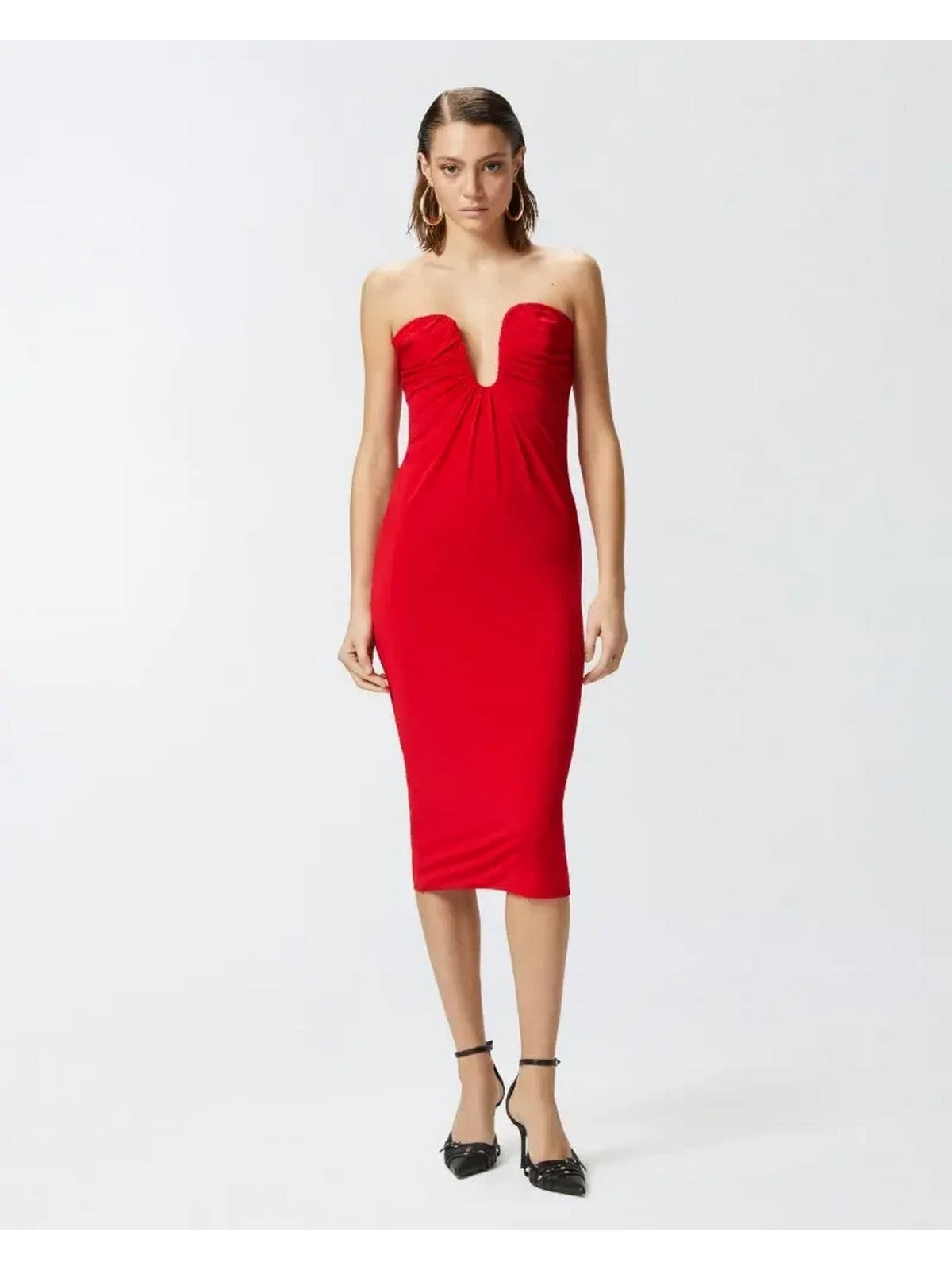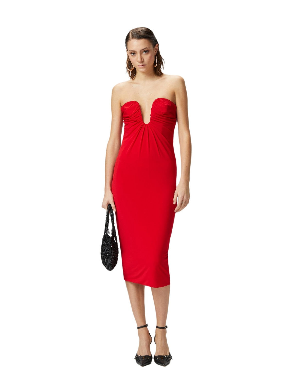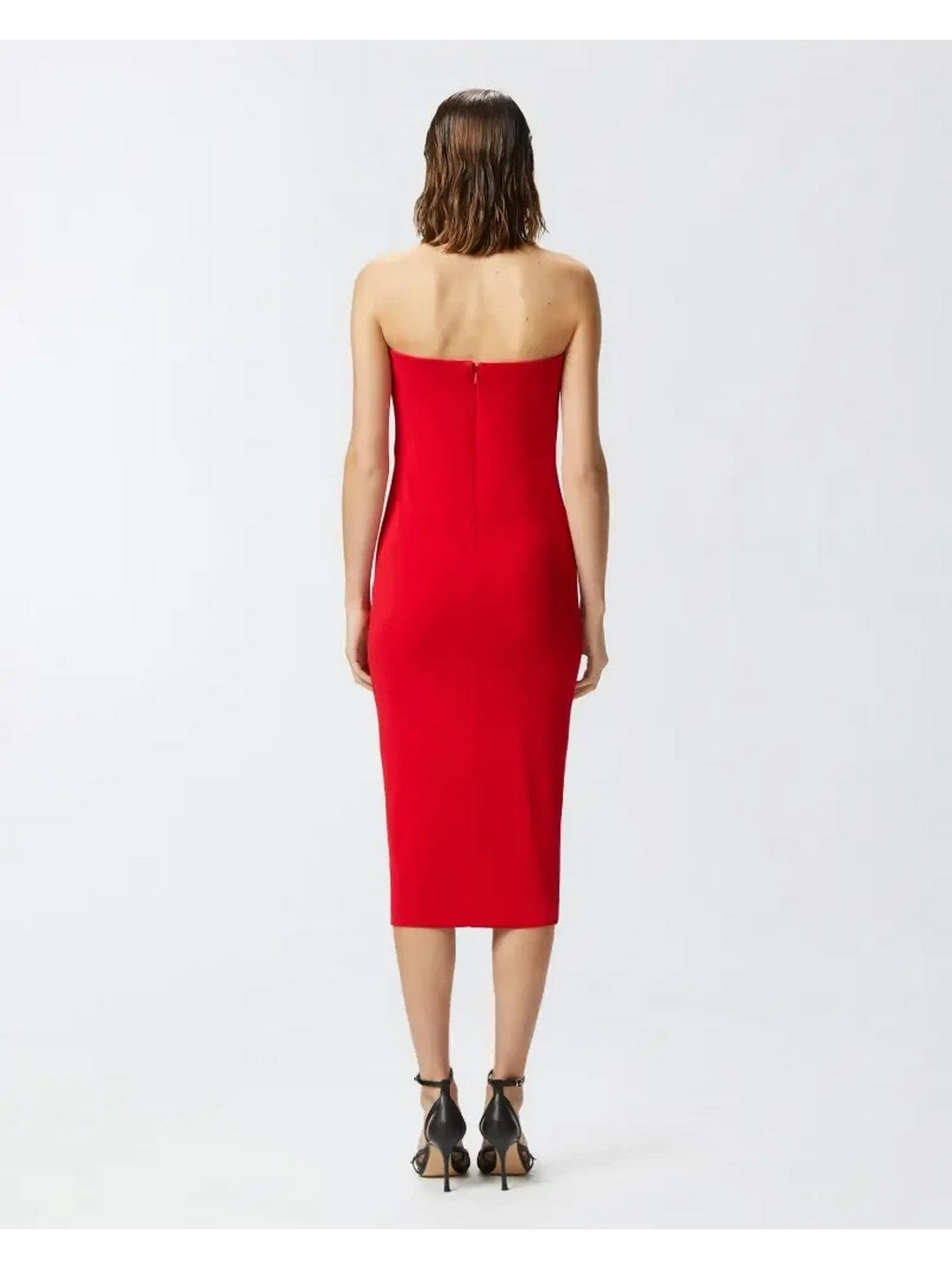 Vestito longuette elegante al ginocchio in jersey light caratterizzato da linea aderente e da scollo sagomato iper femminile, con arricci e drappeggi. Il capo è realizzato con il 68% di viscosa da foreste gestite responsabilmente. La linea senza maniche e senza spalline di questo abito lascia le spalle e la parte superiore della schiena scoperti, per mettere in luce i tuoi punti più femminili. Chiusura con zip invisibile nel centro dietro. Accendi le tue occasioni speciali e serate di festa con questo abito da sera pensato per dare un valore unico alla tua femminilità, soprattutto se abbinato a un paio di scarpe décolleté dal tacco alto.