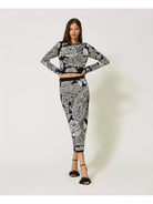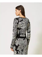 Sweter TWINSET z elastycznego żakardu wiskozowego i błyszczącego żakardu pikietowego z motywem kaszmiru i róż. Okrągły dekolt, długie rękawy w rękawiczkach, obszyte profile z gładkimi wykończeniami z dzianiny. Dopasowany krój, owalna blaszka z logo T z tyłu.