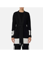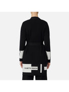 ELISABETTA FRANCHI viscose wrap cardigan. Logos inlaid in shiny viscose on the sleeves, back, and waistband create bold color-block effects.