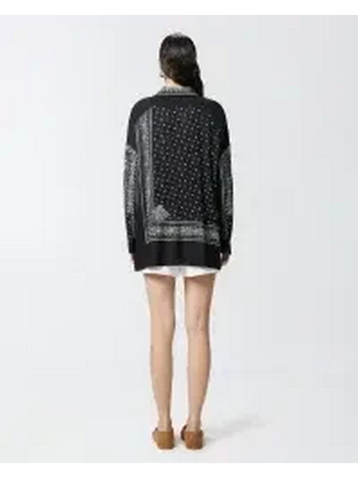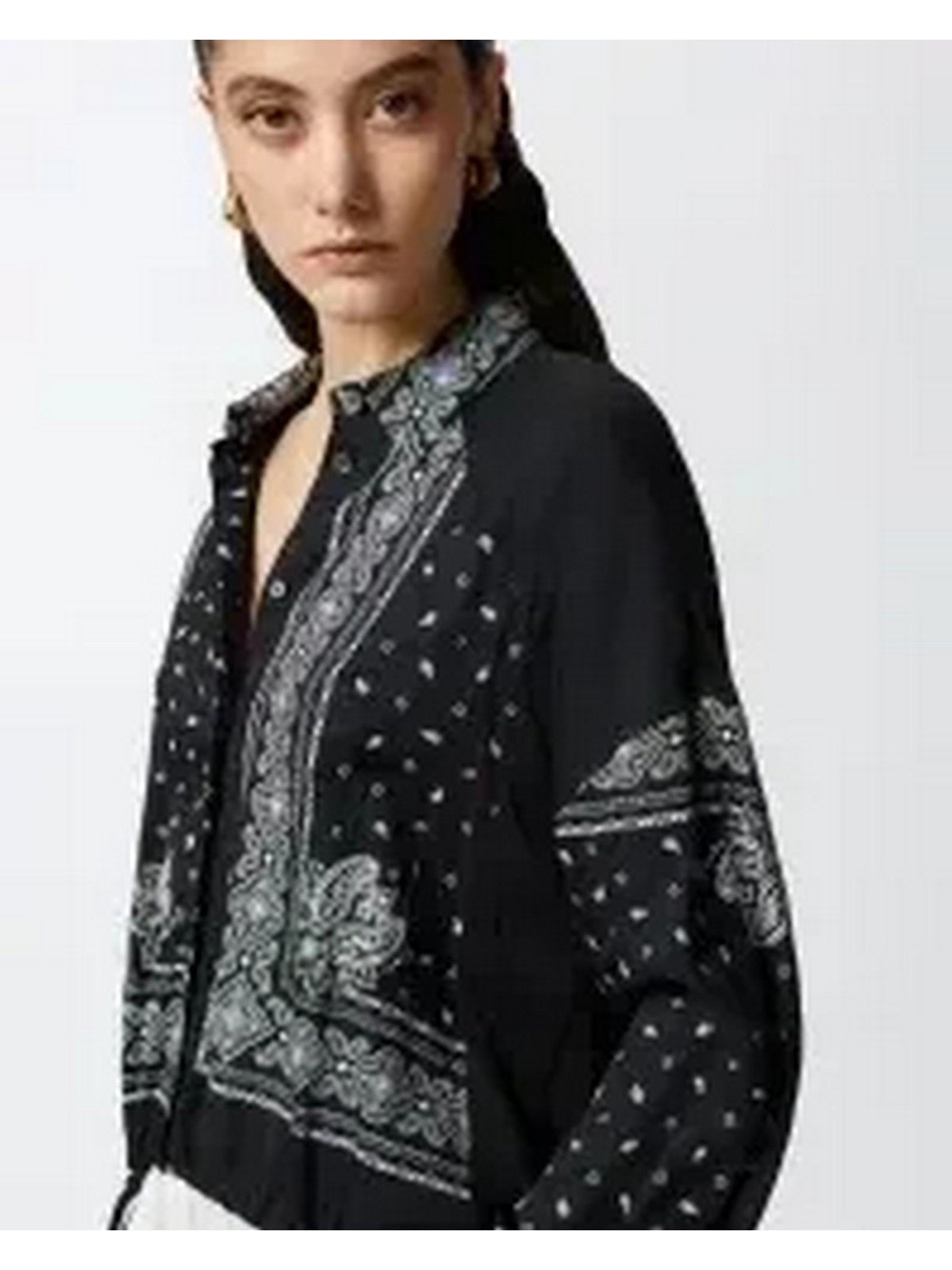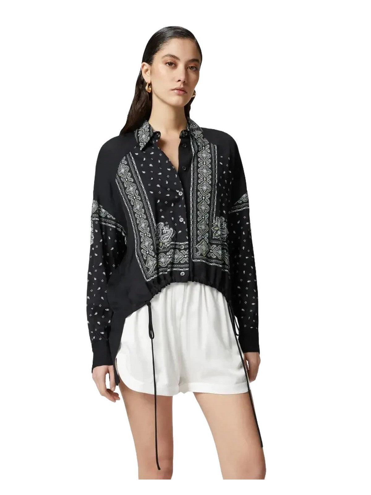 Women's viscose twill shirt featuring a personalized bandana print and lightweight, single-color viscose georgette inserts. The shirt is asymmetrical, longer at the back, while the shorter front is finished with a drawstring at the bottom, creating a slight gather. The bandana print shirt features a point collar, low-cut sleeves, and a front button closure. The bandana print shirt is perfect for completing your daytime looks with a fun and original touch, offering a high degree of customization, thanks in part to its asymmetrical features.
