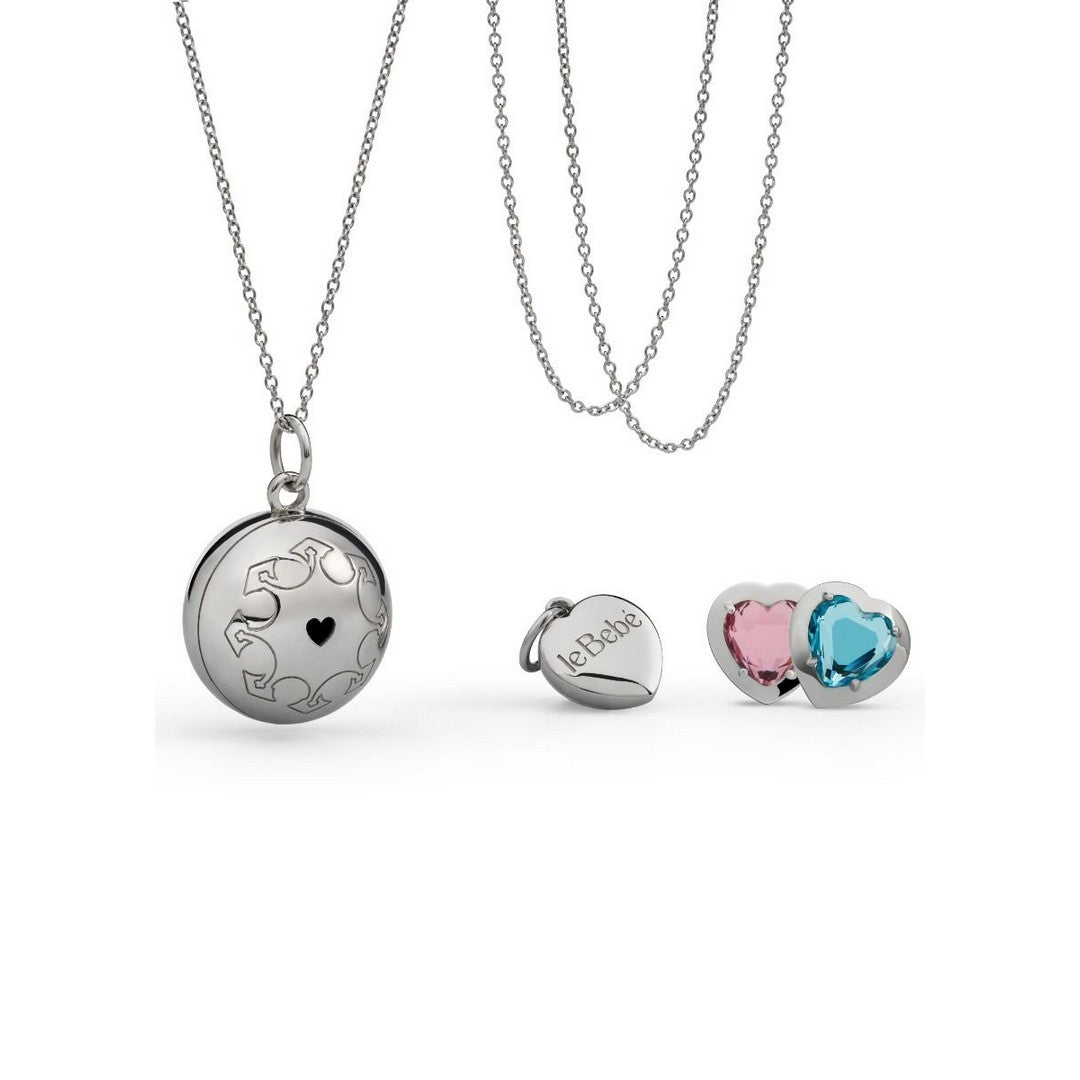 "Oh Baby" pendant in silver with interchangeable blue and pink stones, with an additional small heart pendant