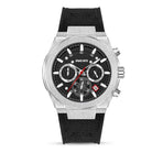 Questo modello distribuito da Locman è parte della linea DT004 in cui il design sportivo è accentuato dalle forme anni '70 e dall'attacco integrato del cinturino. Movimento al quarzo cronografo, misure cassa 43,5x45,5mm e cinturino in tessuto e silicone nero