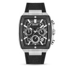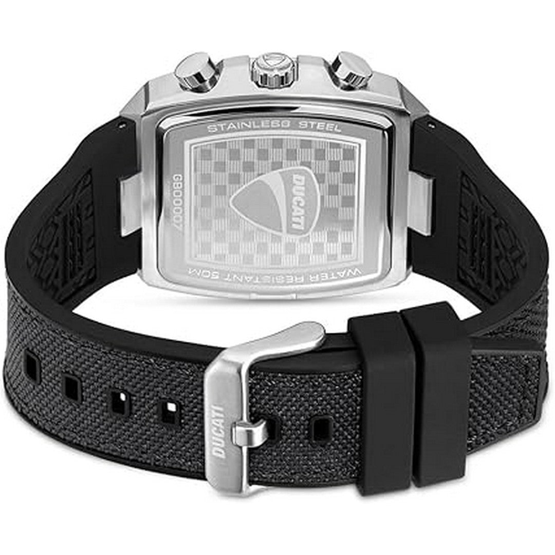 Questo modello è parte della linea DT005 in cui il design del quadrante richiama le strutture dei motori per un maggiore carattere sportivo. Movimento al quarzo cronografo, misure cassa 40x47mm in acciaio, cinturino in tessuto nero
