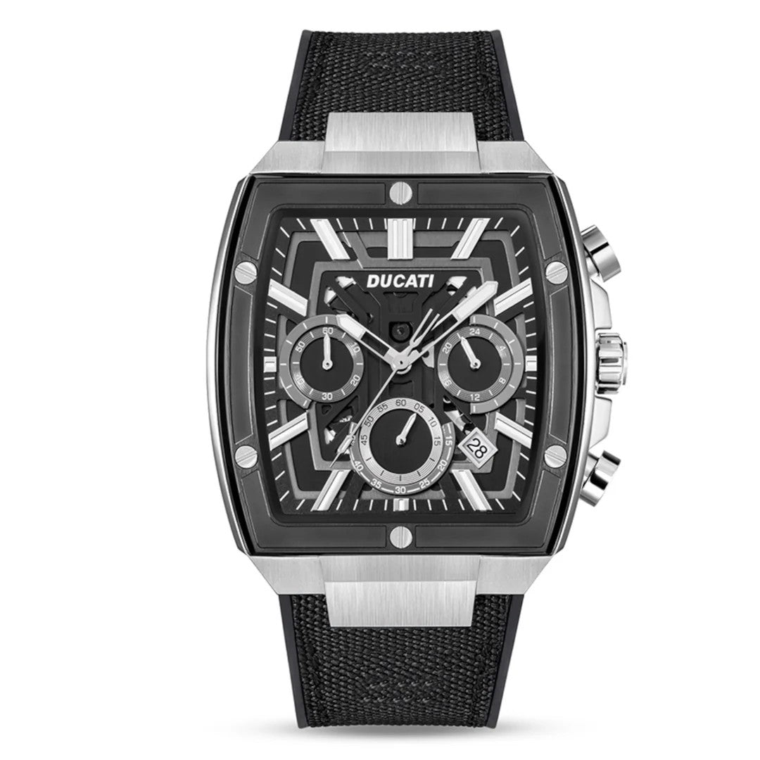 Orologio Ducati Corse by Locman cronografo con cassa tonneau da 40mm in acciaio con lunetta e quadrante nero scheletrato con logo Ducati, cinturino in tessuto di nylon nero cod DTWGO0001001