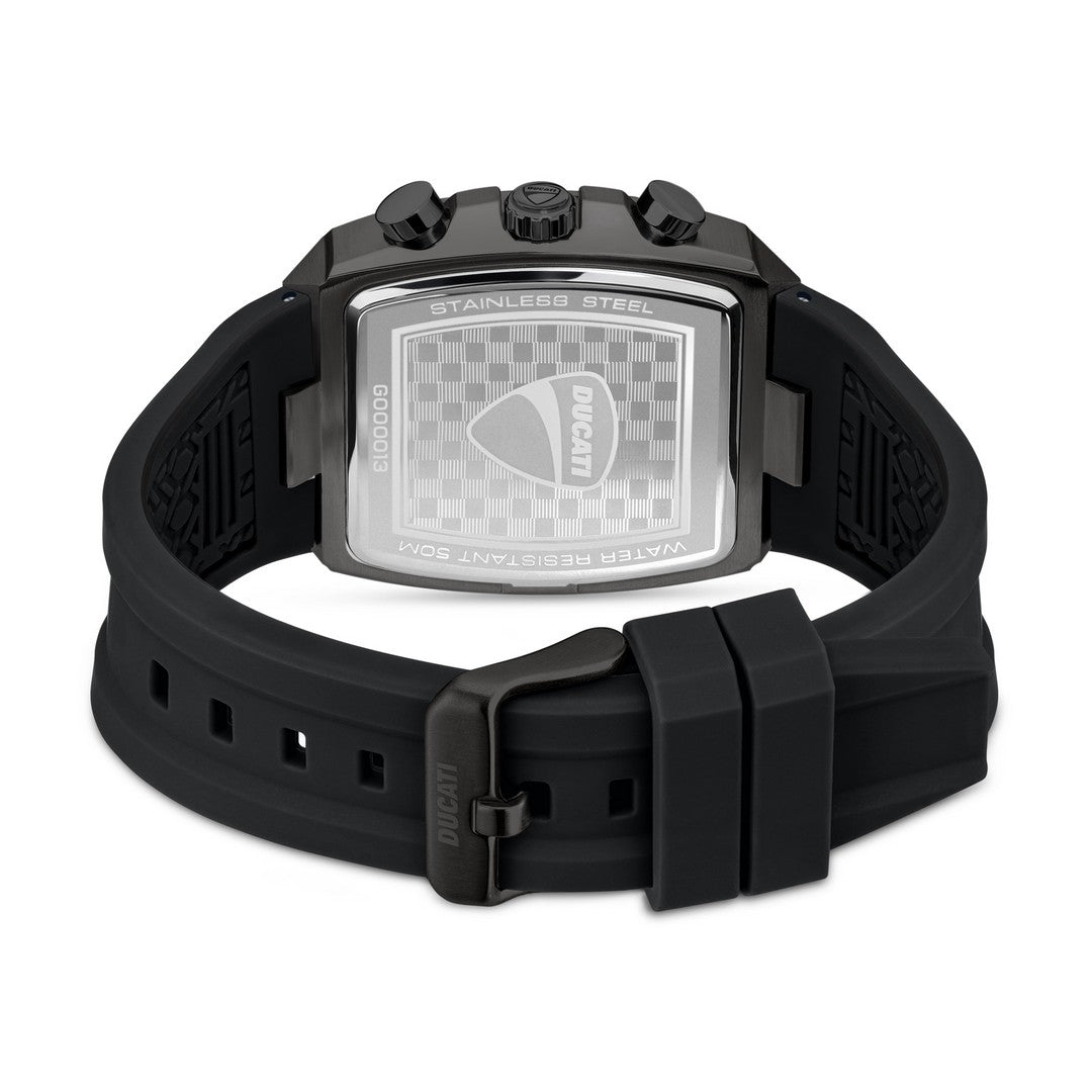 Cinturino in gomma nera con chiusura ad ardiglione e logo Ducati sulla fibbia, quadrante nero con dettagli oro rosa, resistente all'acqua 5 Atm.